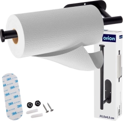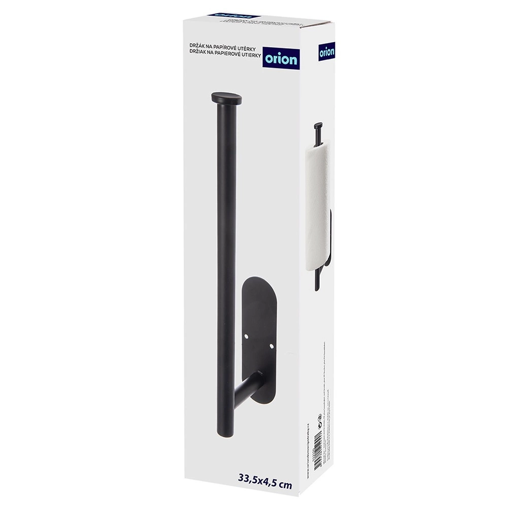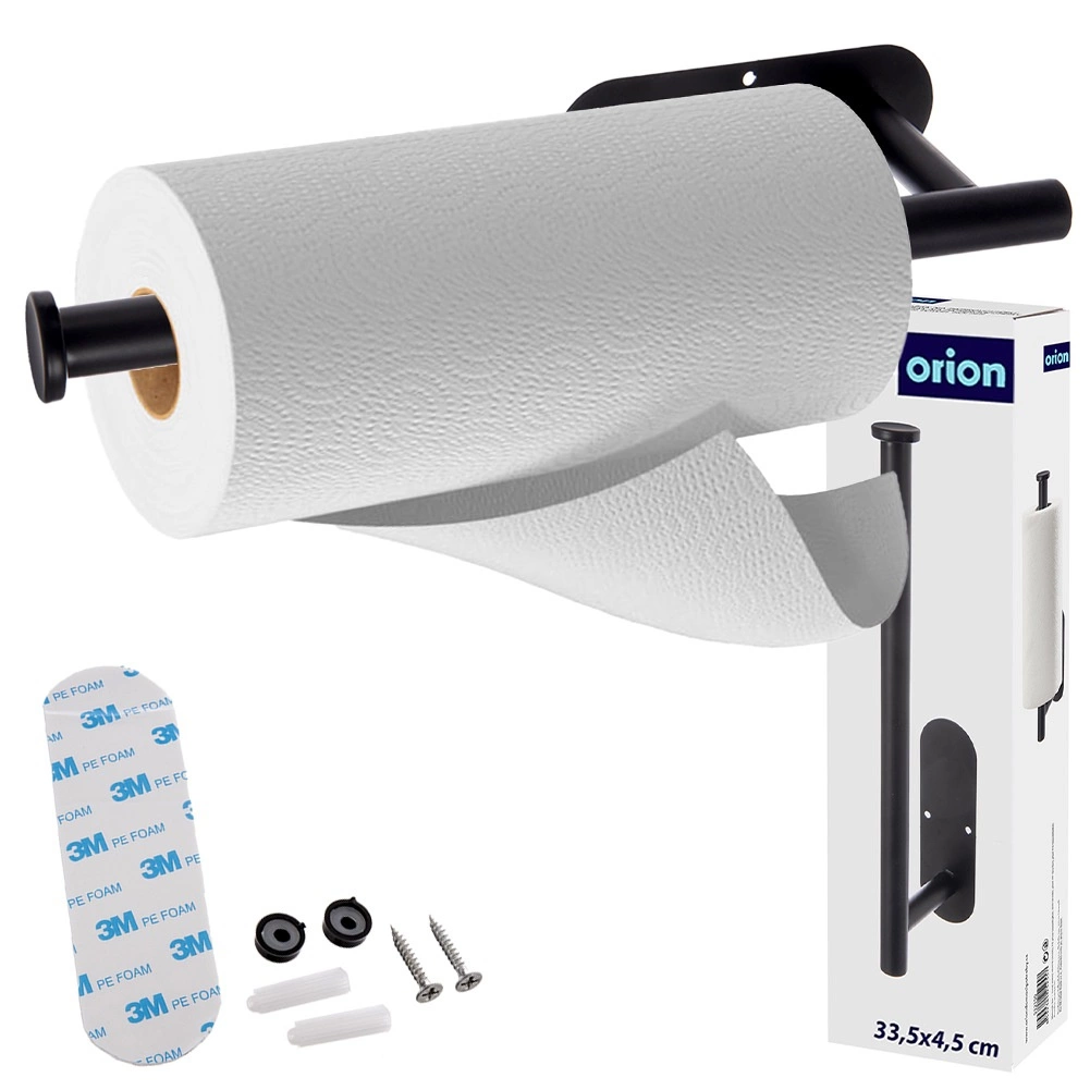 A practical wall-mounted paper towel holder made of durable metal in black saves space and allows quick, convenient one-handed tearing. With two mounting options (3M no-drill adhesive or screws), it’s suitable for the kitchen, bathroom, and office. The universal size 33.5 × 9.2 × 4.5 cm is compatible with standard rolls, and the stable construction ensures long service life.