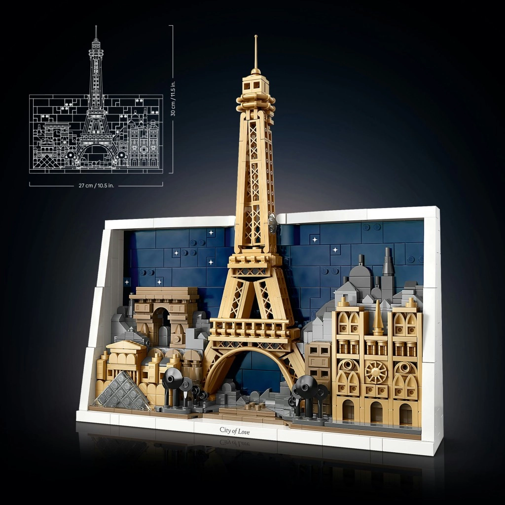 Discover the magic of Paris with the designer set LEGO Architecture Paris – City of Love. Build the iconic Eiffel Tower, Notre-Dame, Arc de Triomphe, and the Louvre in an elegant frame with a starry backdrop. An ideal wall or shelf decoration, and a great gift for lovers of architecture, travel, and design. Includes a decorative “City of Love” tile and 958 pieces for relaxing building.