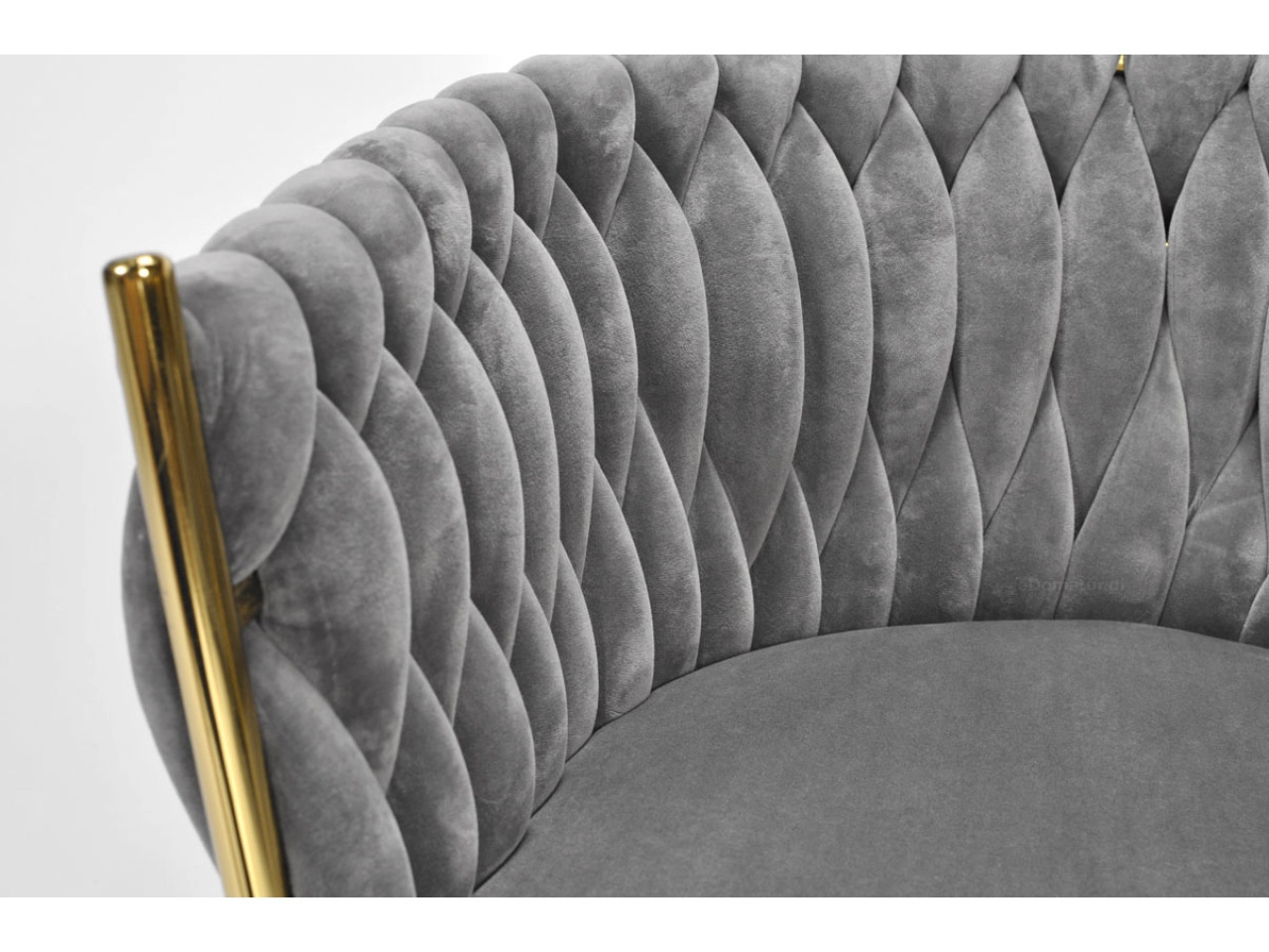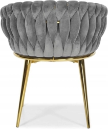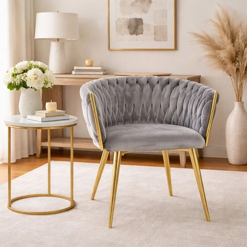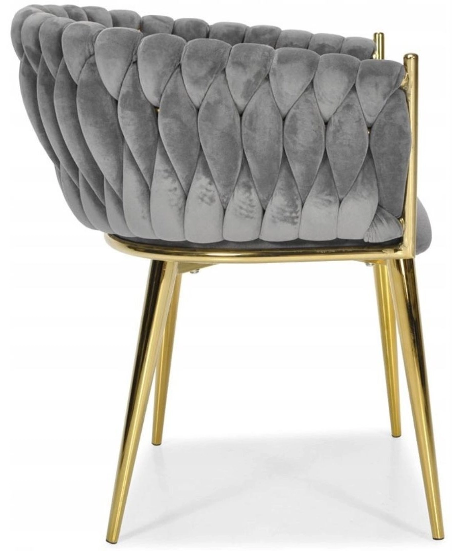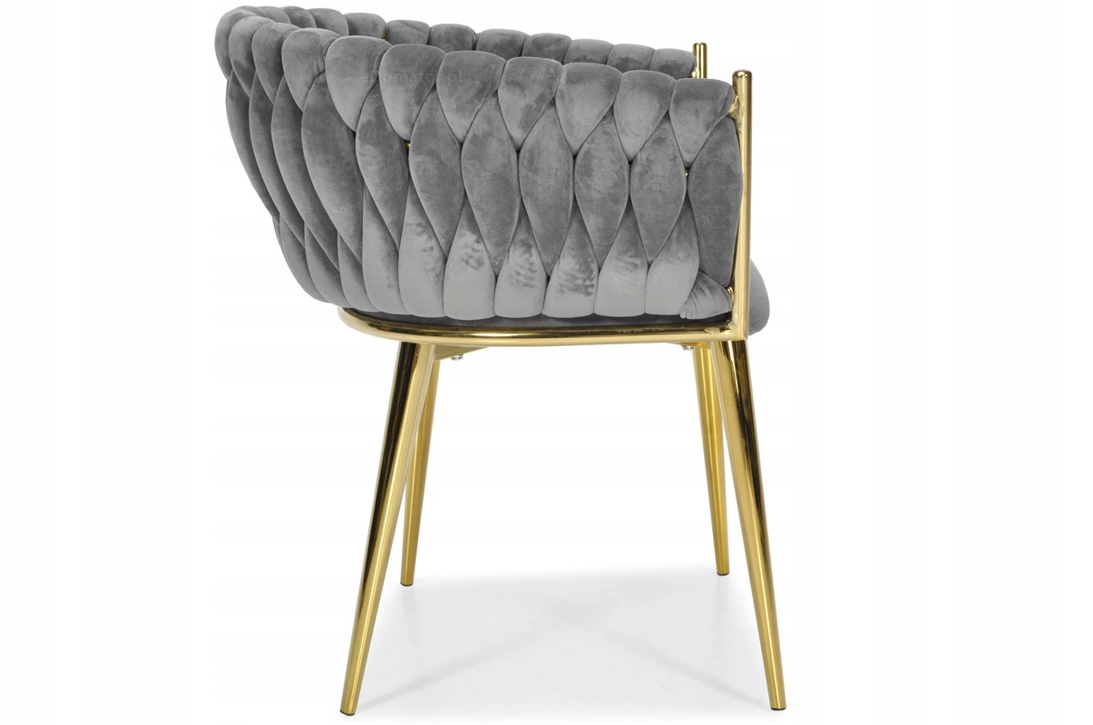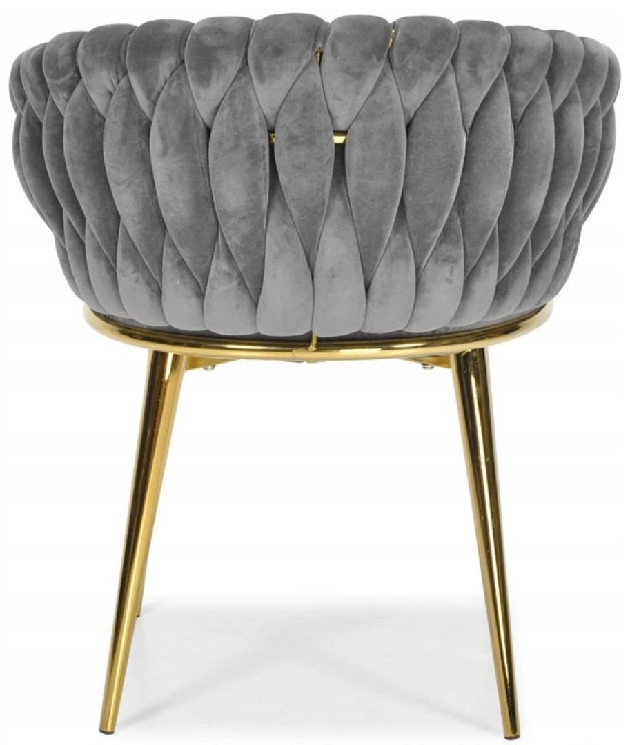 This stylish velvet chair brings an instant “wow” effect to your interior. The subtly lustrous velvet in a gray tone pairs perfectly with gold accents, black, white, and natural wood. The woven 3D backrest upholstery adds a luxurious look and turns the chair into a design focal point for the dining room, living room, or vanity corner.