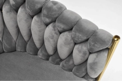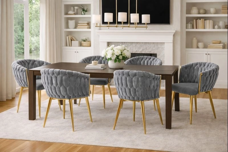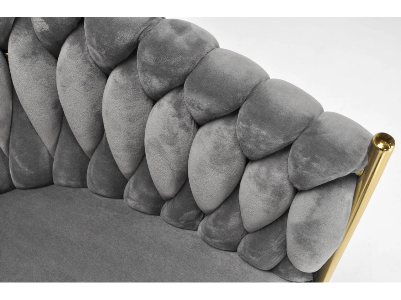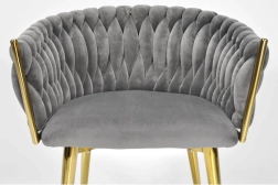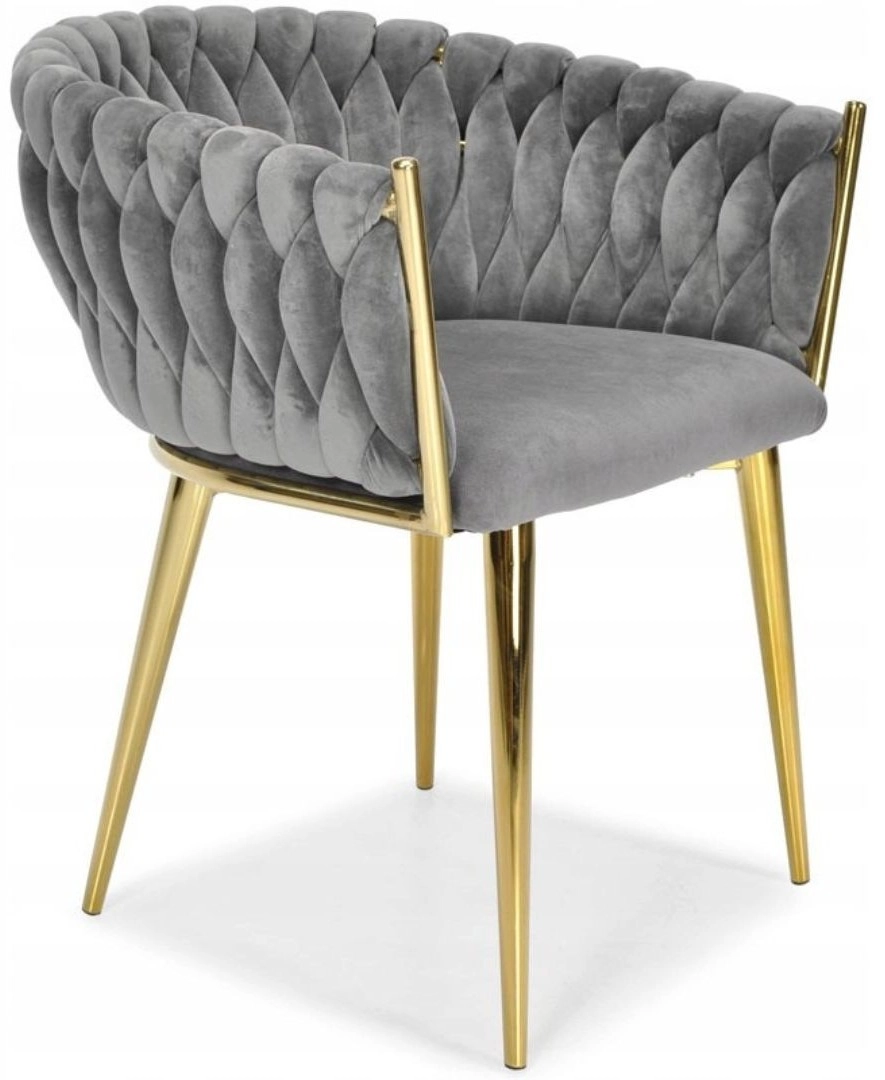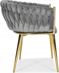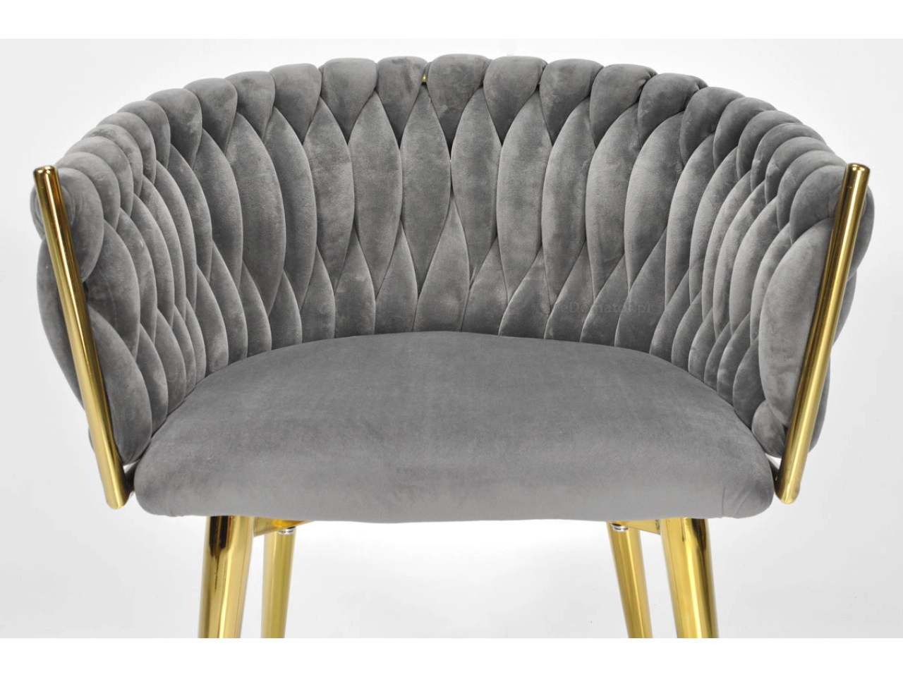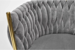This stylish velvet chair brings an instant “wow” effect to your interior. The subtly lustrous velvet in a gray tone pairs perfectly with gold accents, black, white, and natural wood. The woven 3D backrest upholstery adds a luxurious look and turns the chair into a design focal point for the dining room, living room, or vanity corner.