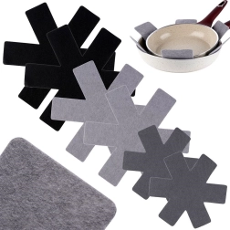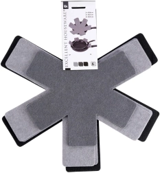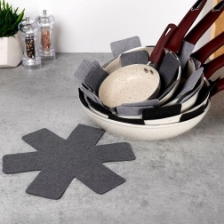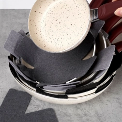 A practical set of felt inserts for safely stacking pans, pots, and bowls. The pack includes 6 pieces in three sizes that reliably prevent scratches on non-stick surfaces and save space in your cupboards. Protects cookware, prevents scuffs, and enables worry-free stacking.