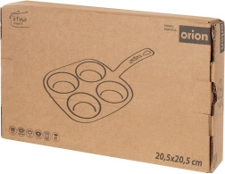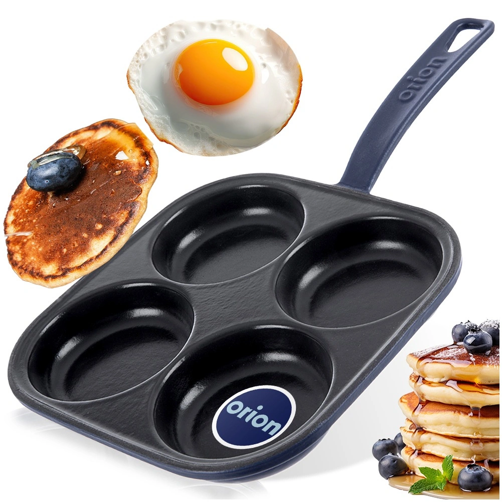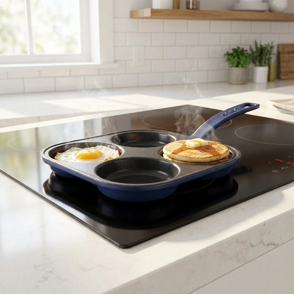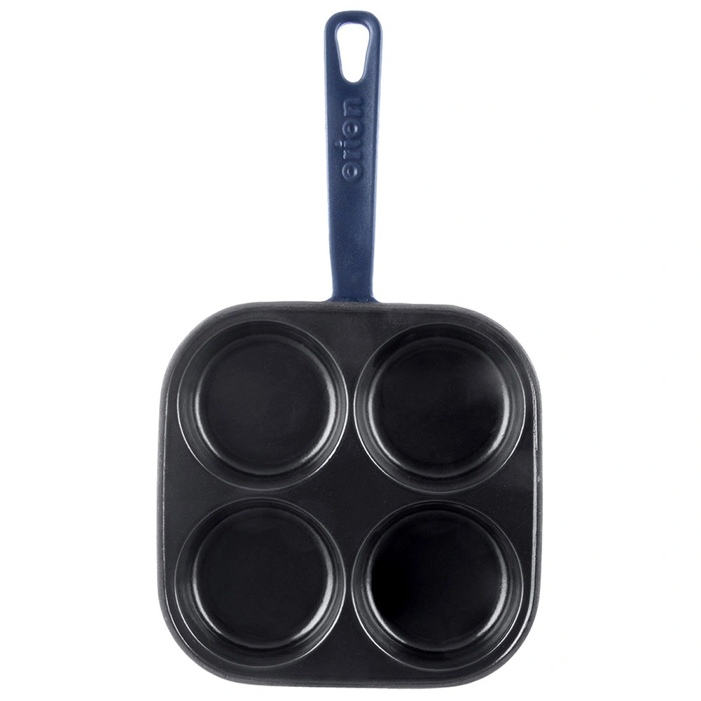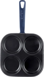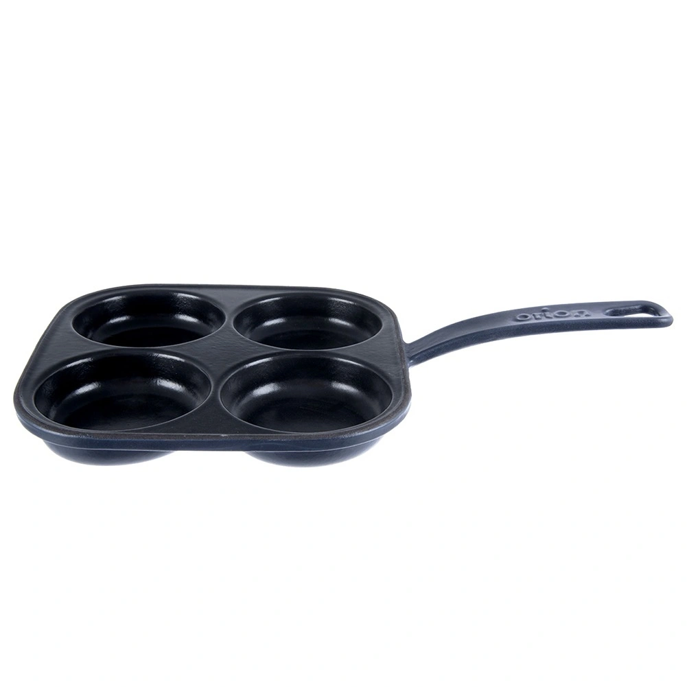 A square cast iron pan measuring 20.5 × 20.5 cm with four separate cups (Ø 9 cm) ensures quick preparation of eggs, pancakes, and mini crepes in a perfect shape. The black enameled surface minimizes sticking and makes serving easier, while the outer body and handle in a blue shade give the pan an elegant look.