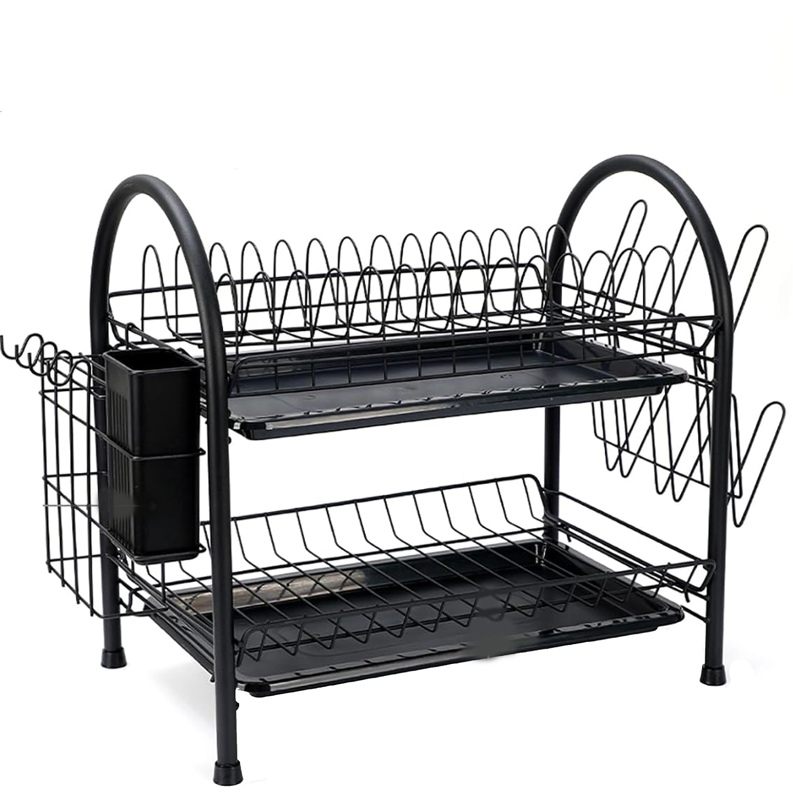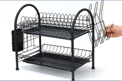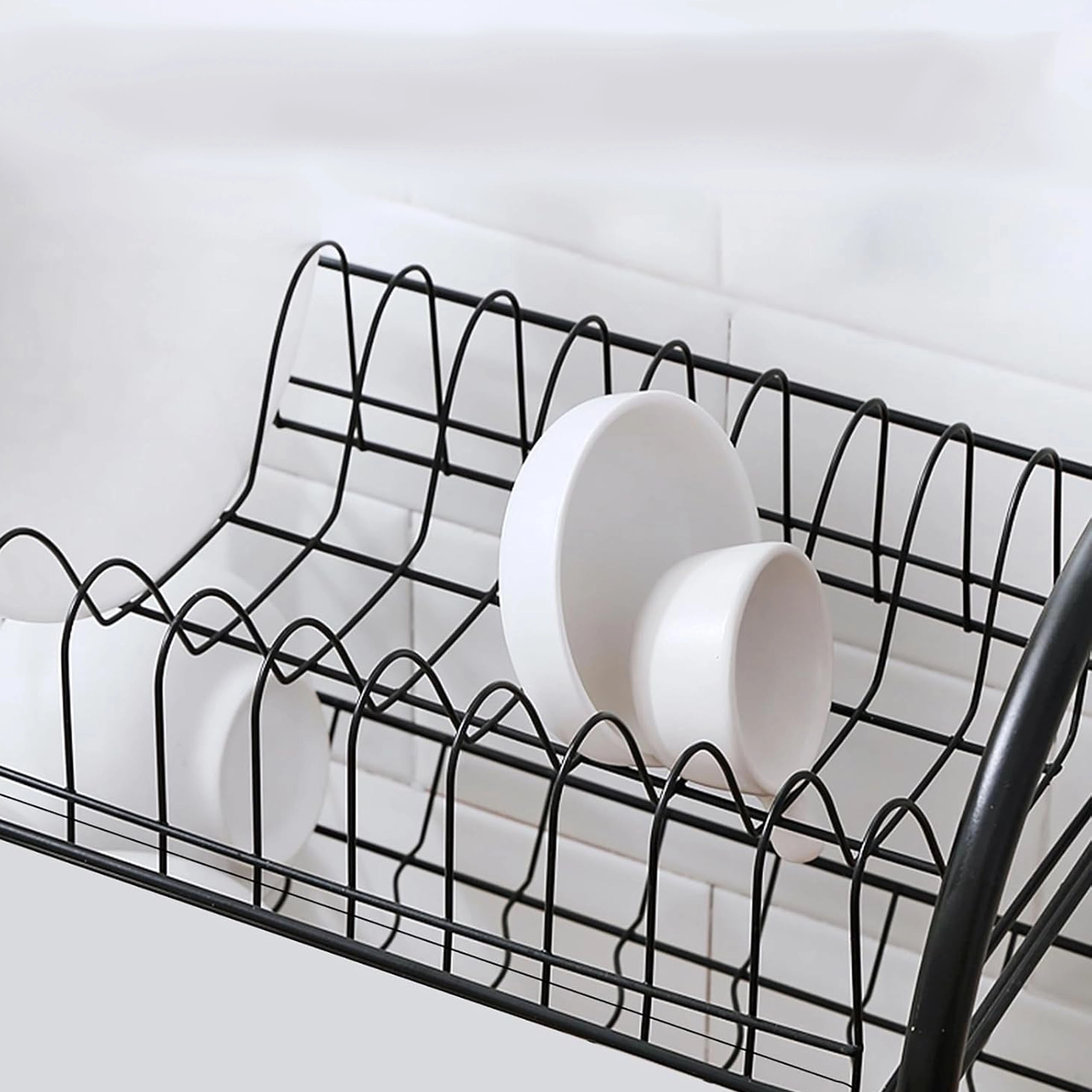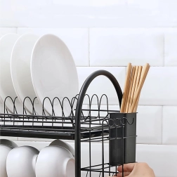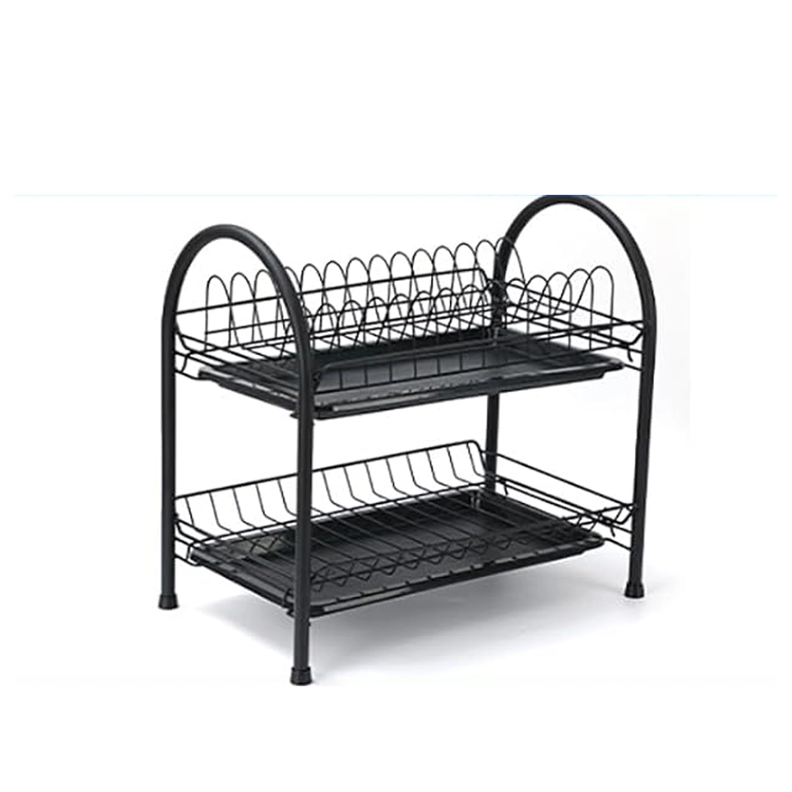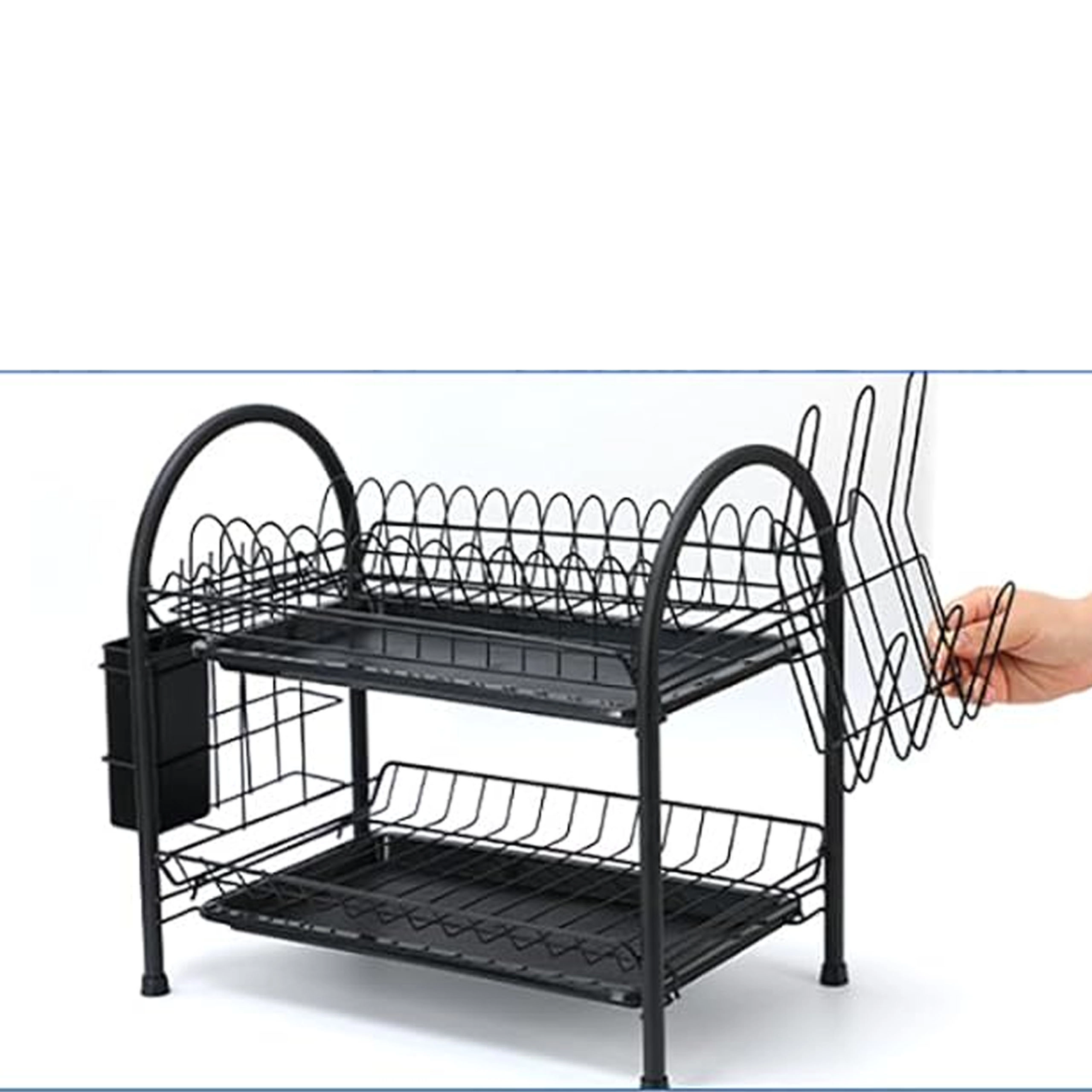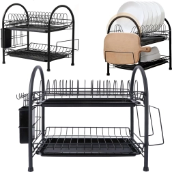A practical two-tier dish rack made of durable metal in an elegant black finish offers large capacity, a stable construction, and removable drip trays to keep your countertop dry and clean. With two levels, it efficiently dries plates, bowls, glasses, and cutlery while keeping your kitchen organized.