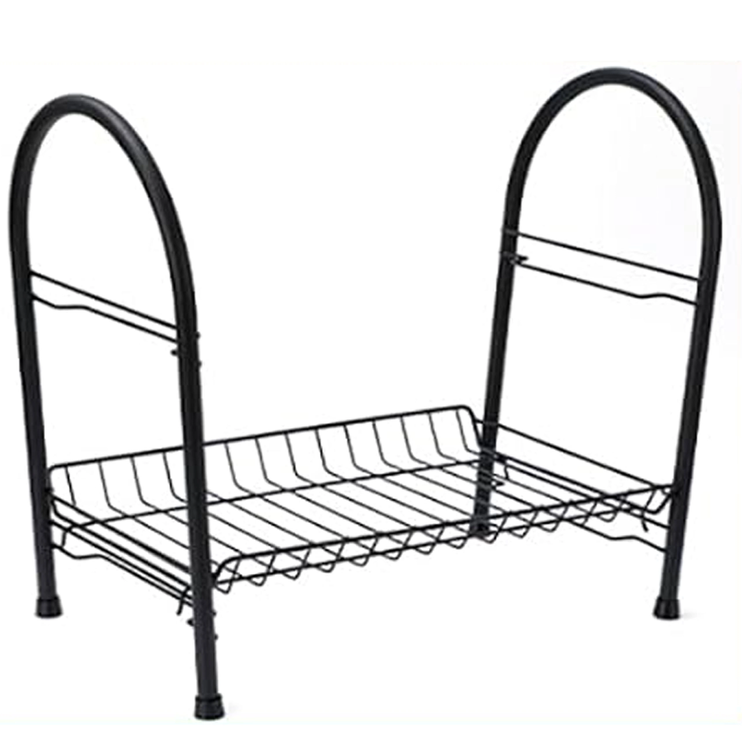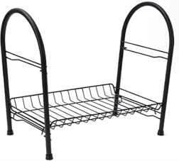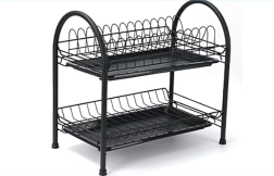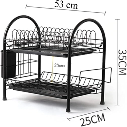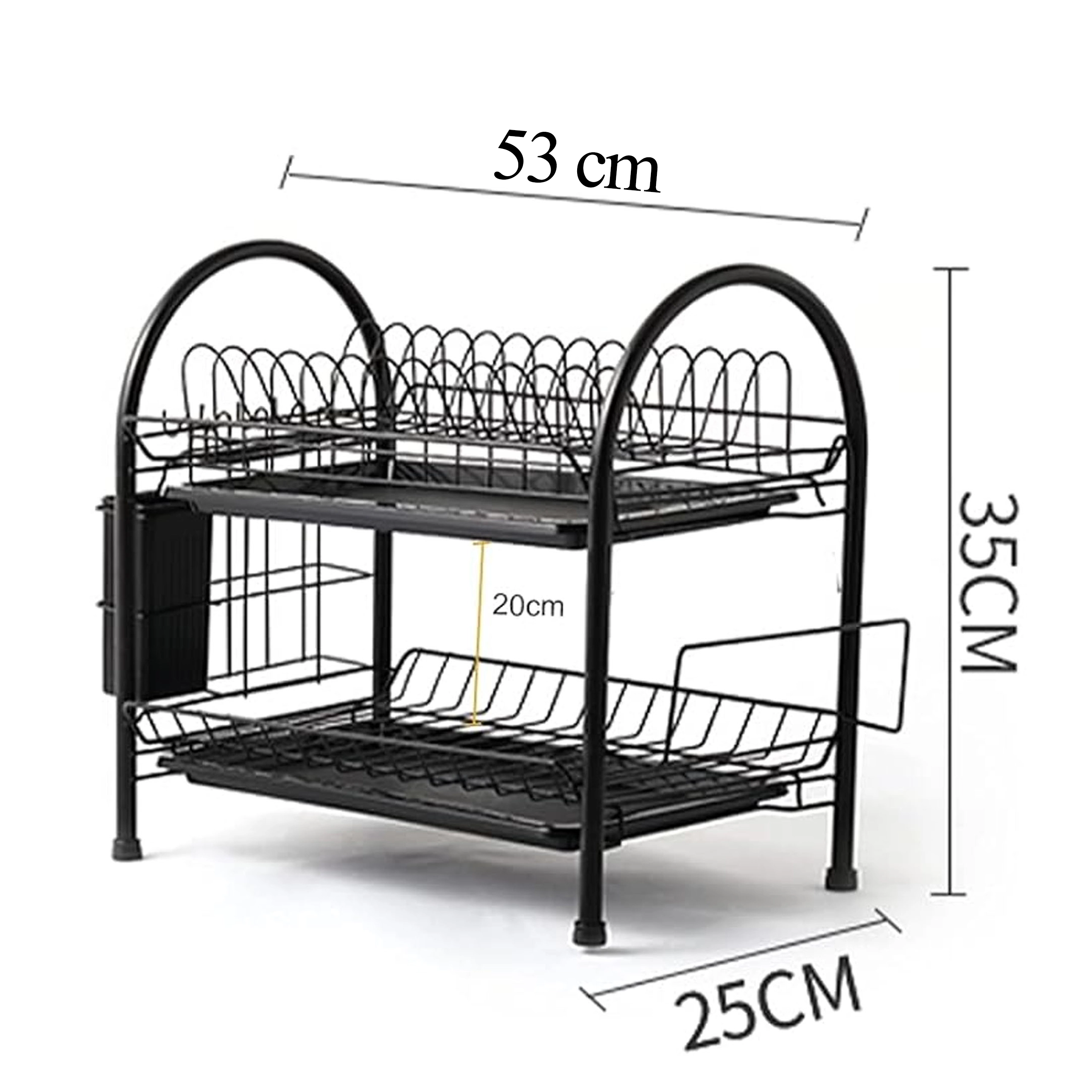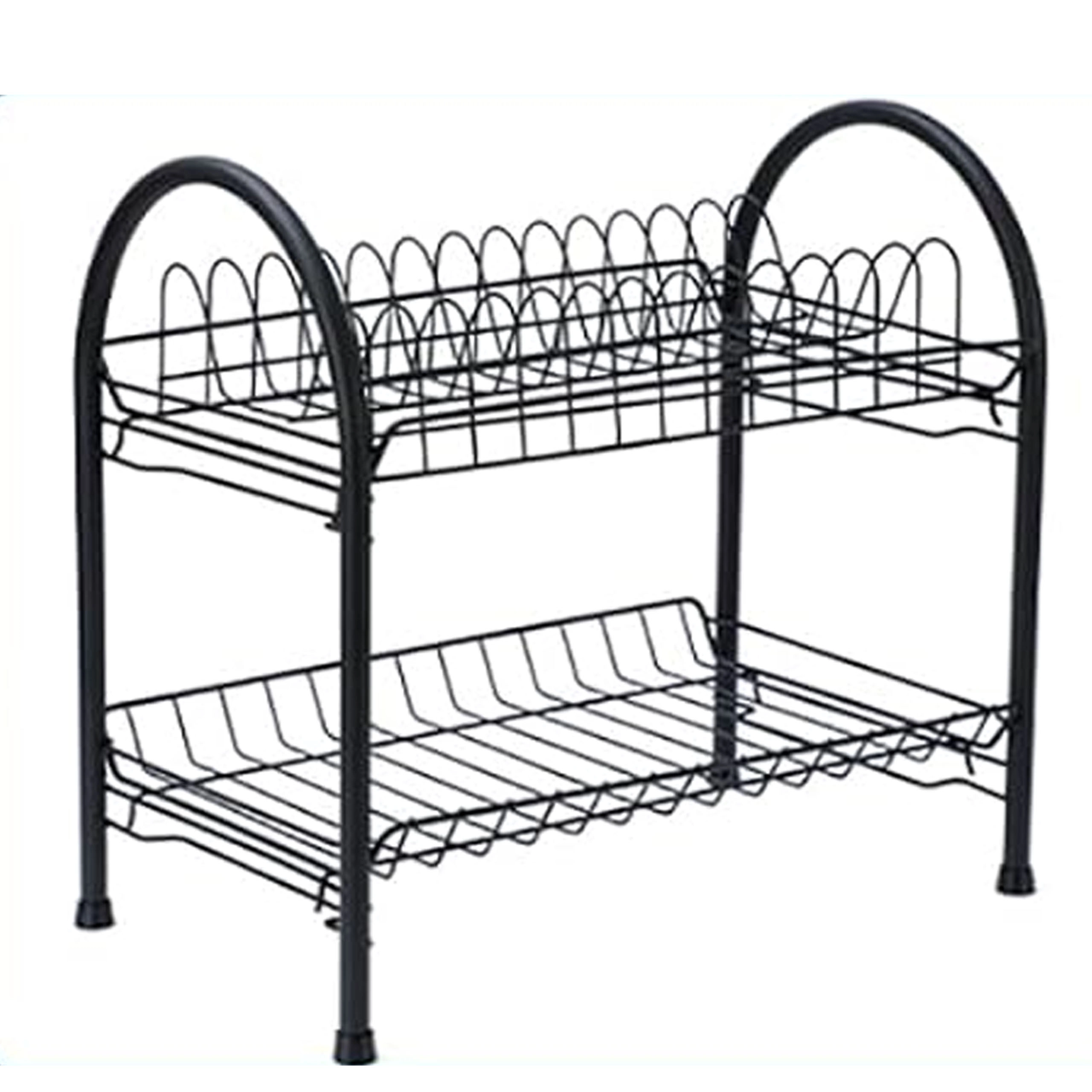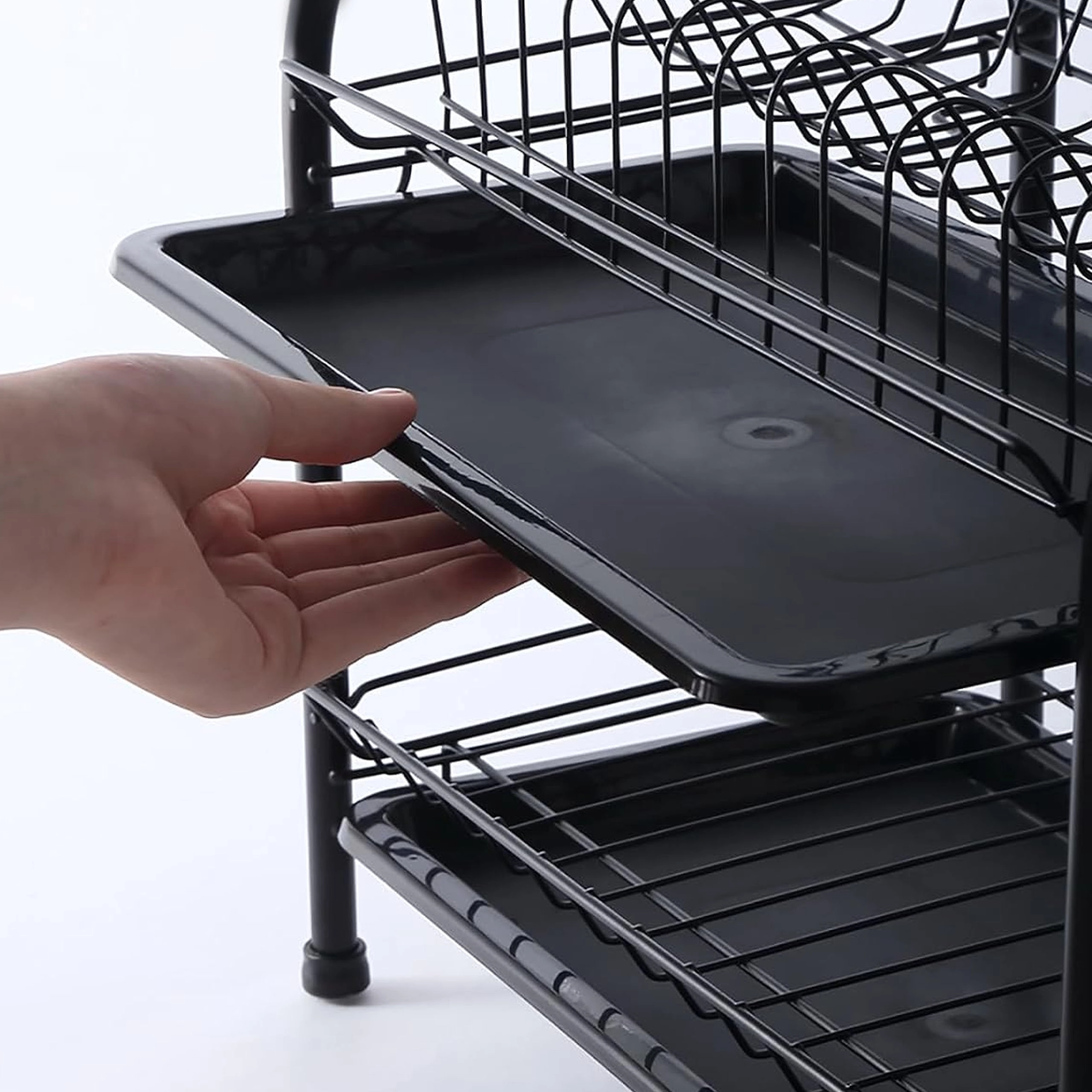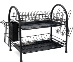 A practical two-tier dish rack made of durable metal in an elegant black finish offers large capacity, a stable construction, and removable drip trays to keep your countertop dry and clean. With two levels, it efficiently dries plates, bowls, glasses, and cutlery while keeping your kitchen organized.