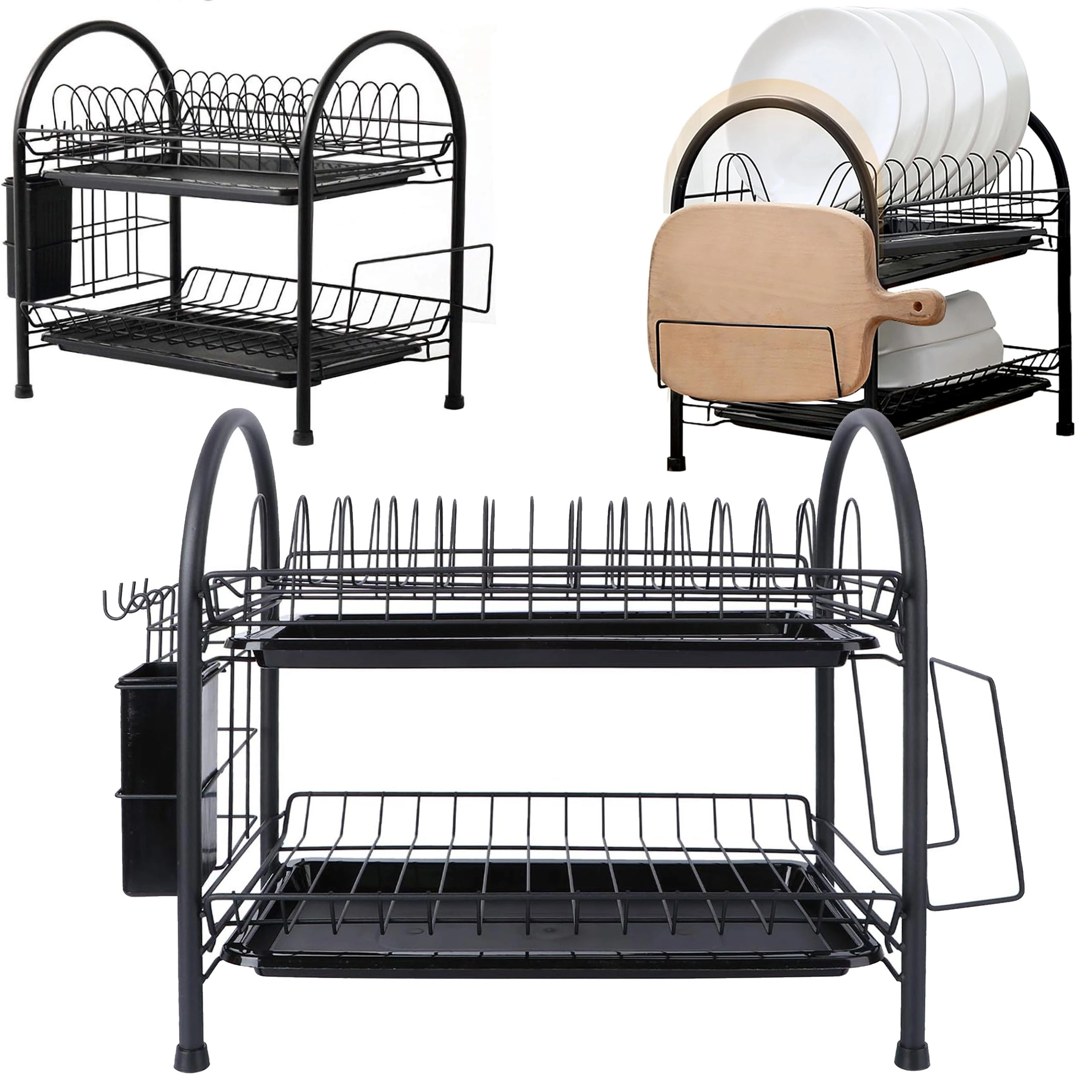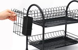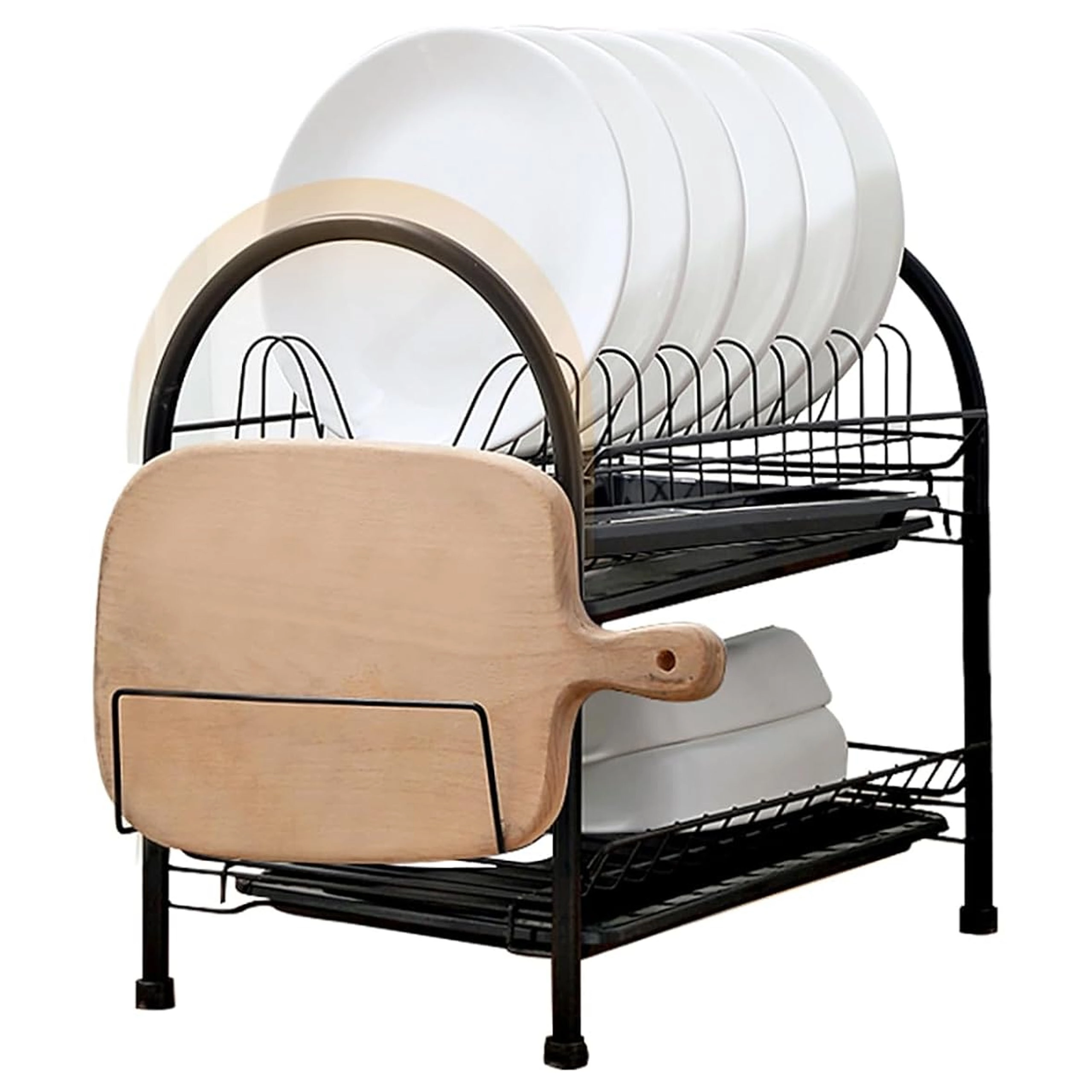 This spacious two-tier dish rack combines a sturdy metal build with a modern design that fits any kitchen. The top tier is ideal for plates, the bottom for bowls or glasses, and the side holders accommodate cutlery and a cutting board. Removable trays catch water and keep the counter drip-free.