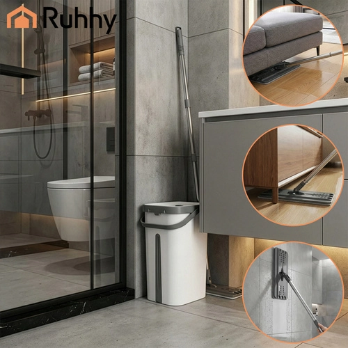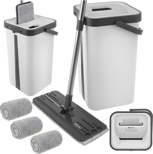 The RUHHY set combines a large dual-chamber bucket for separate rinsing and wringing, so you don’t return dirt to the floor. The hands-free system regulates mop moisture without dripping and is gentle on delicate floors.