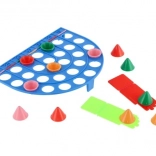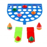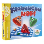 The board's stripes are marked with points, and when a cap drops into a hole in a stripe of the same color, the score is doubled. The rules are intuitive, so you can start playing right away. Kloboučku, hop! develops hand–eye coordination, fine motor skills, and focus, and will entertain for long stretches.