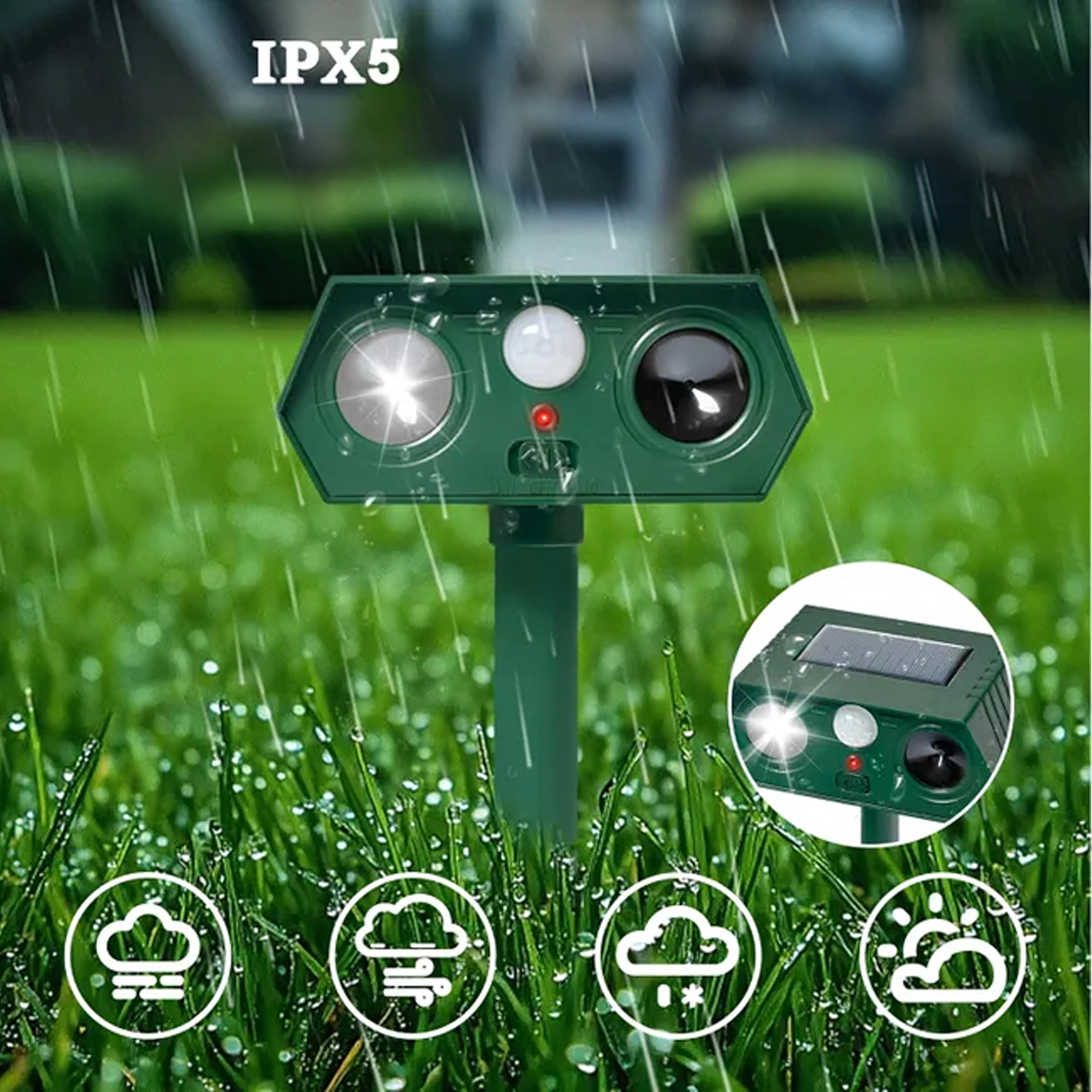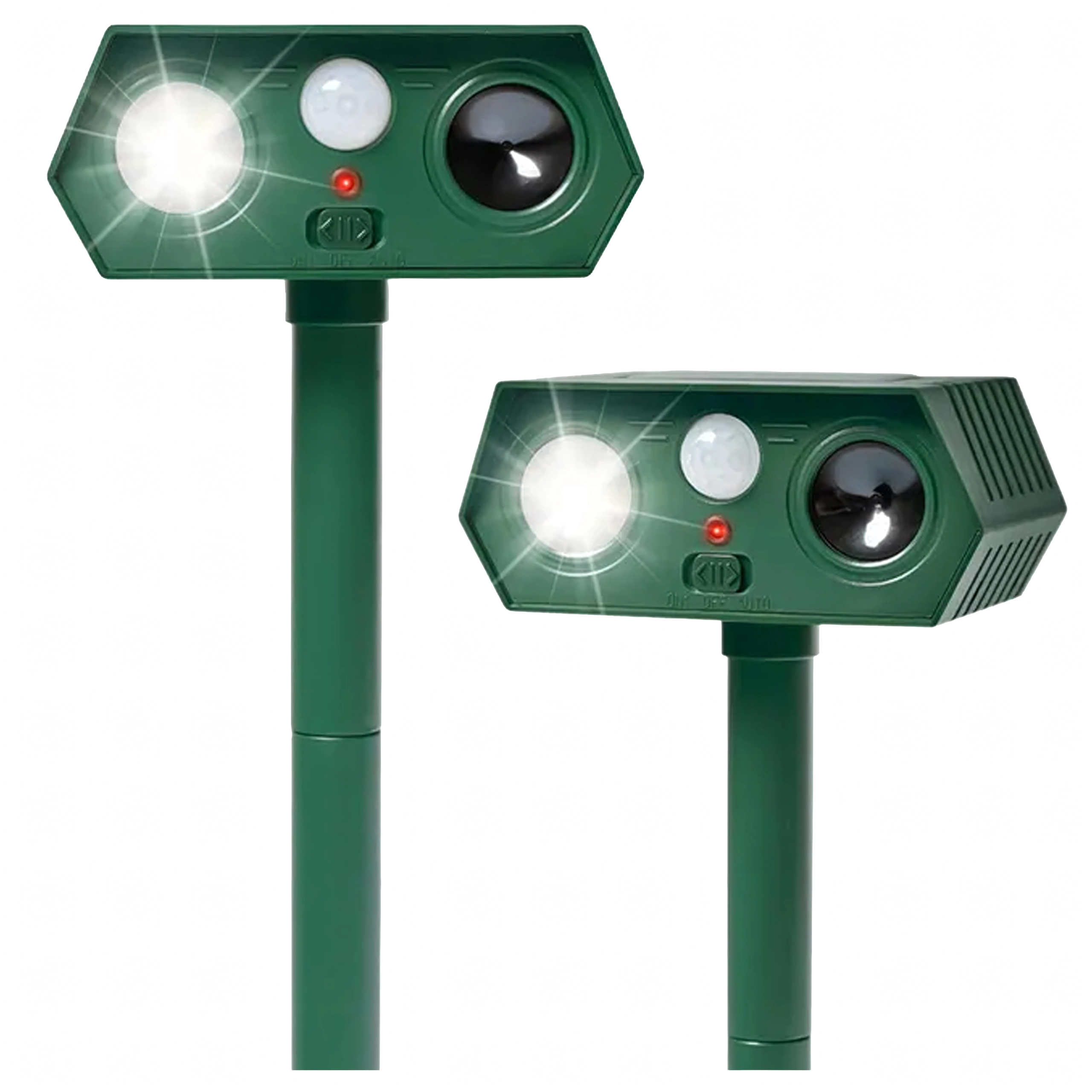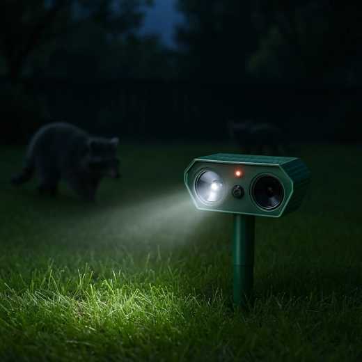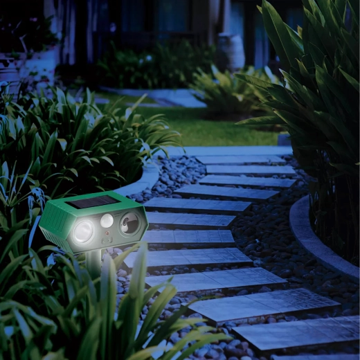 Keep garden beds, lawns, and orchards protected. This pair of outdoor repellers combines a PIR motion detector with ultrasonic waves and a flashing LED light that disrupts animal comfort and makes them leave the area. Thanks to solar power and durable plastic, they are suitable for year-round use with minimal maintenance.
