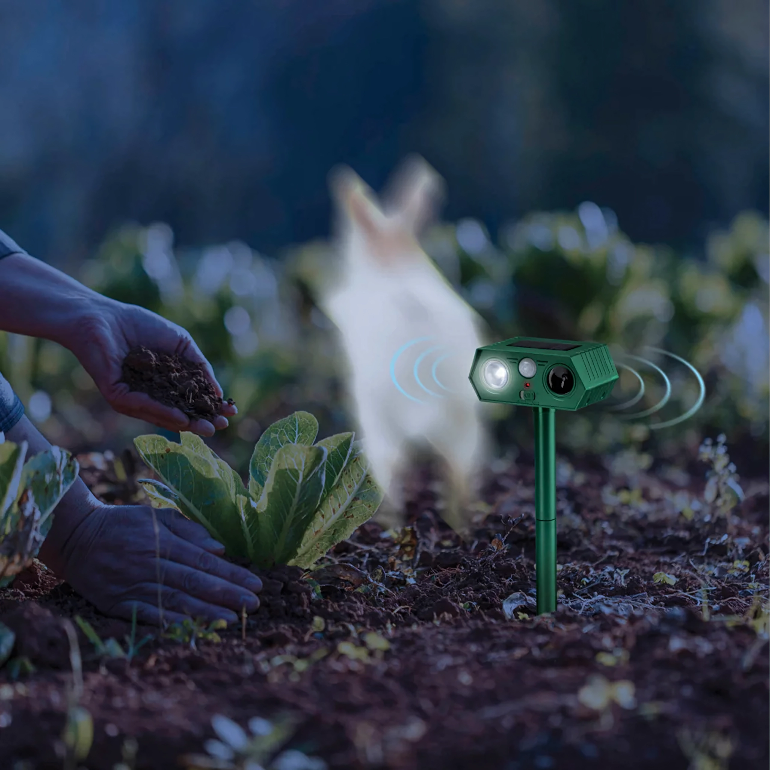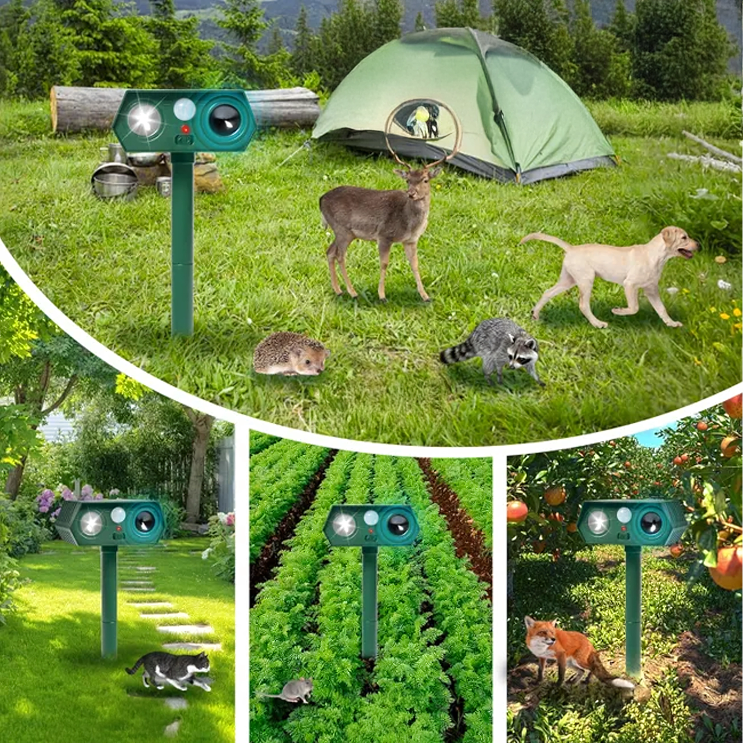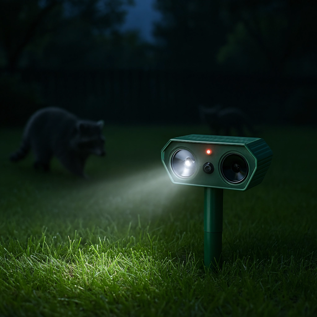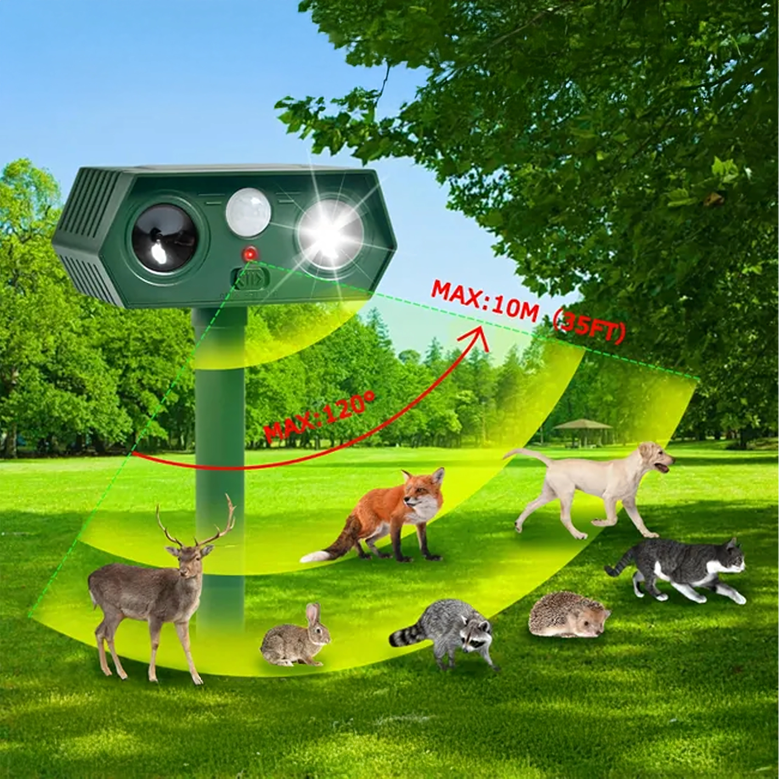The ultrasonic speaker and bright LED light help deter cats, dogs, foxes, martens, hares, squirrels, birds, and small rodents.