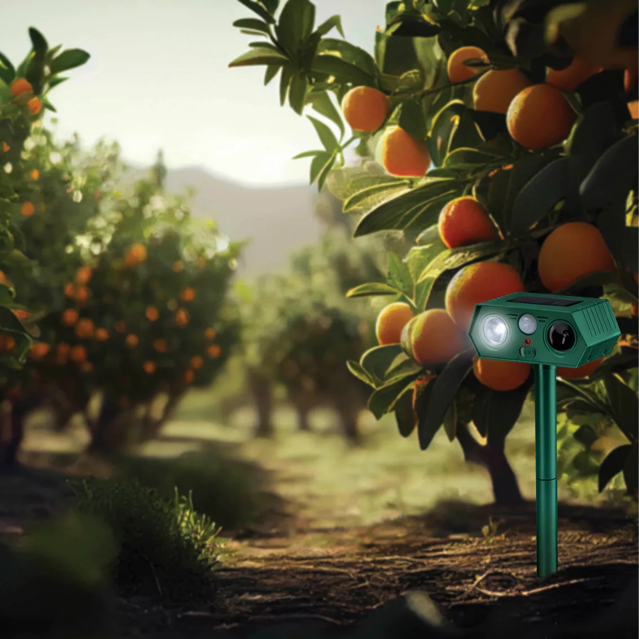Installation takes minutes—simply push the stake into the ground and set the direction. The 2-piece set allows you to effectively protect a wider area of the garden, pathways, or fruit orchard. The device operates quietly for humans but is unpleasant for nuisance wildlife.