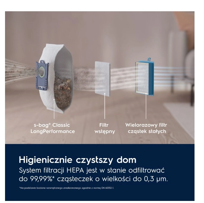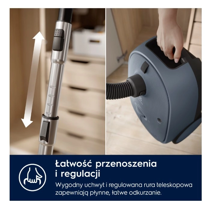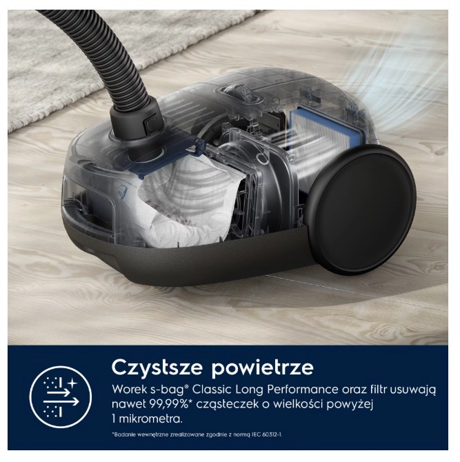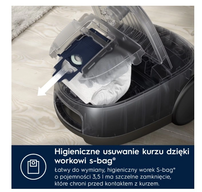 The model is designed with sustainability in mind—up to 50% of the plastic is recycled and the documentation is printed on recycled paper. For the best performance, we recommend genuine S-Bag dust bags, which are durable, filter better, and hold more dirt than paper alternatives.