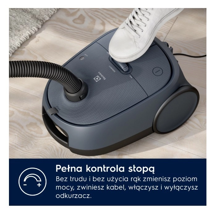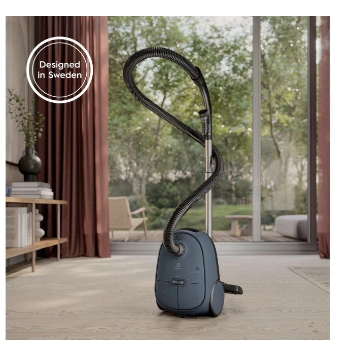 The powerful Electrolux Clean 600 bagged vacuum offers excellent suction performance, a special Dust Magnet Silent nozzle for collecting up to 100% of dust from crevices, 99.99% HEPA filtration, and comfortable foot controls. Recycled materials and a 12 m operating radius ensure convenient and sustainable cleaning.