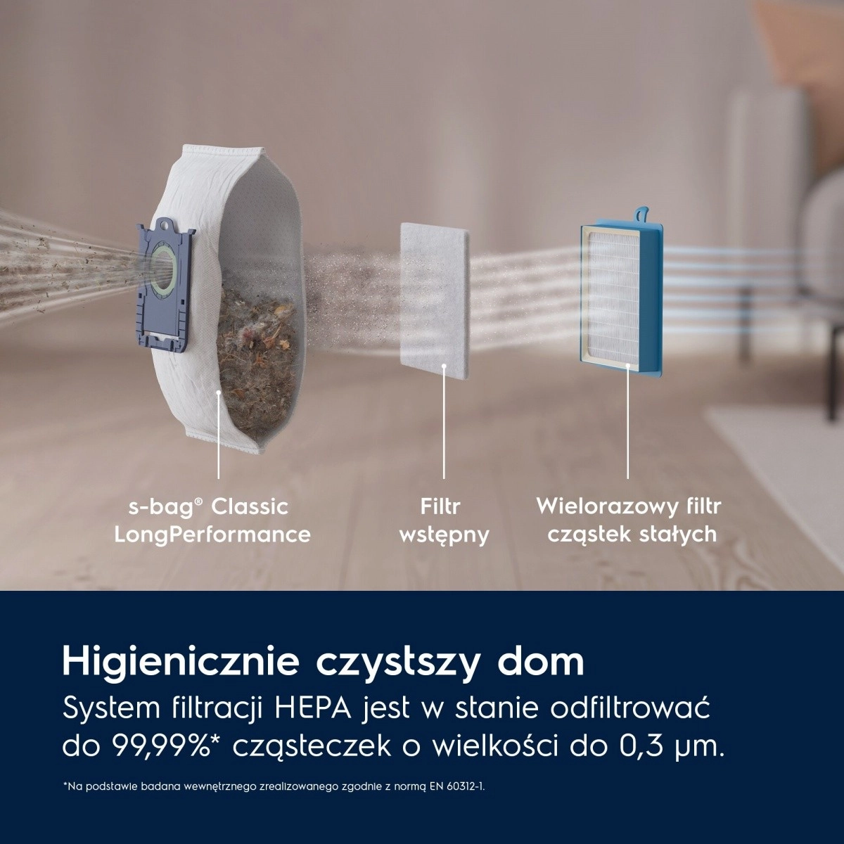 Enjoy a thorough clean without compromise. The Dust Magnet Silent nozzle is designed for maximum efficiency on hard floors and carpets, achieving up to 100% dust pickup in crevices*. The advanced HEPA filter captures fine particles as small as 0.3 μm, including dust, mites, and allergens, so you breathe cleaner air at home.