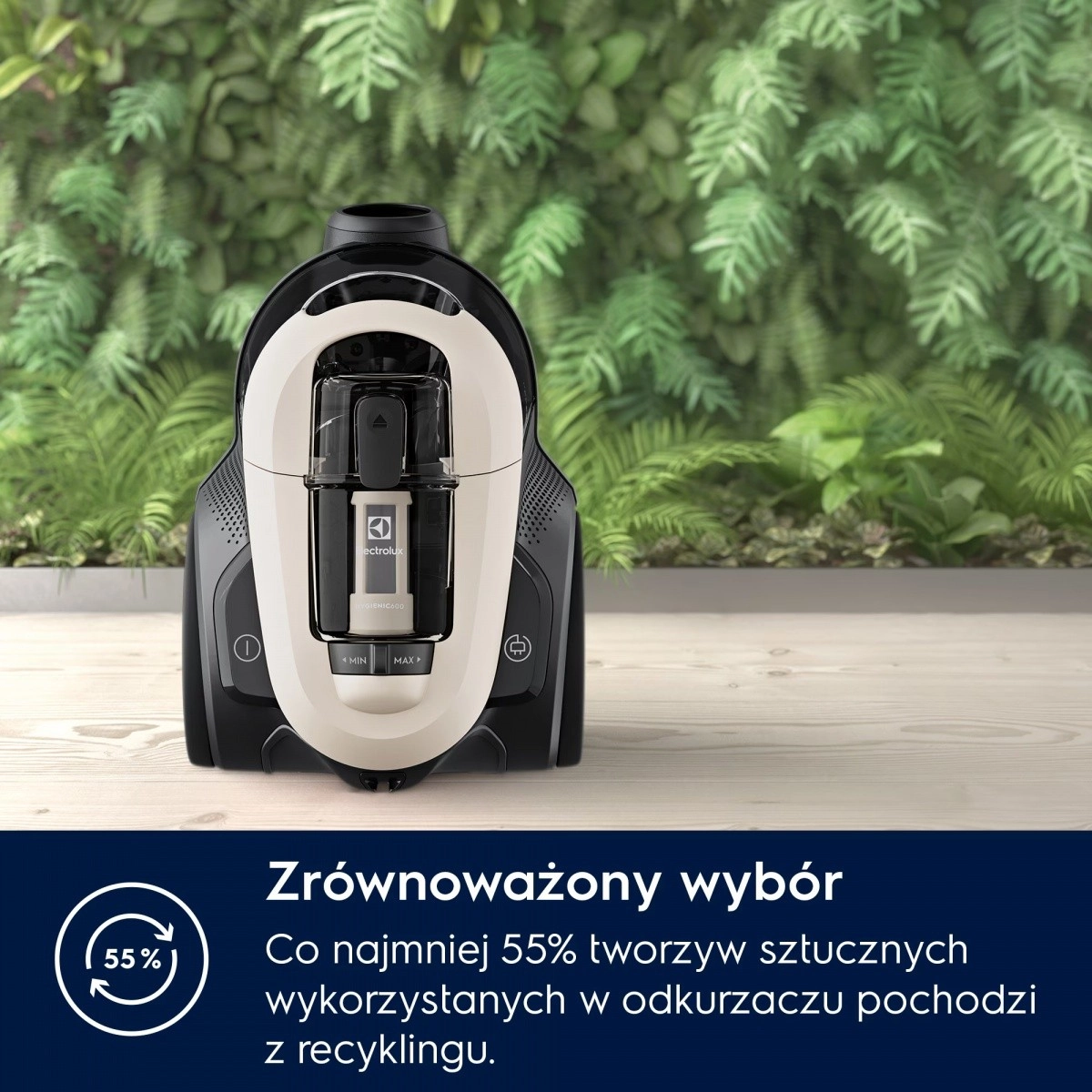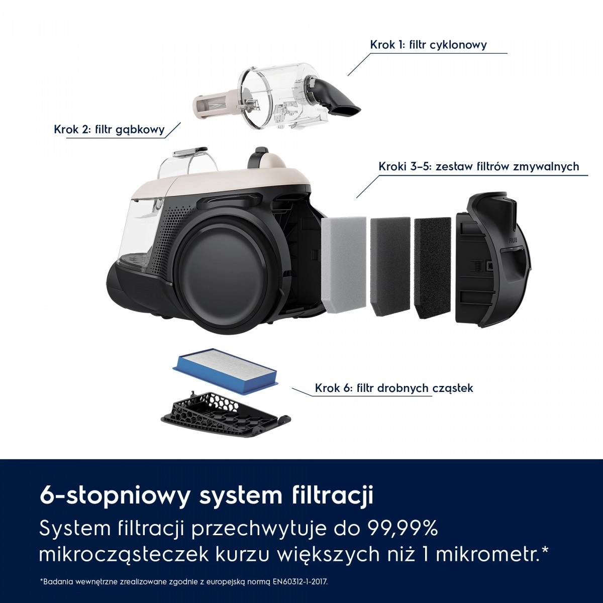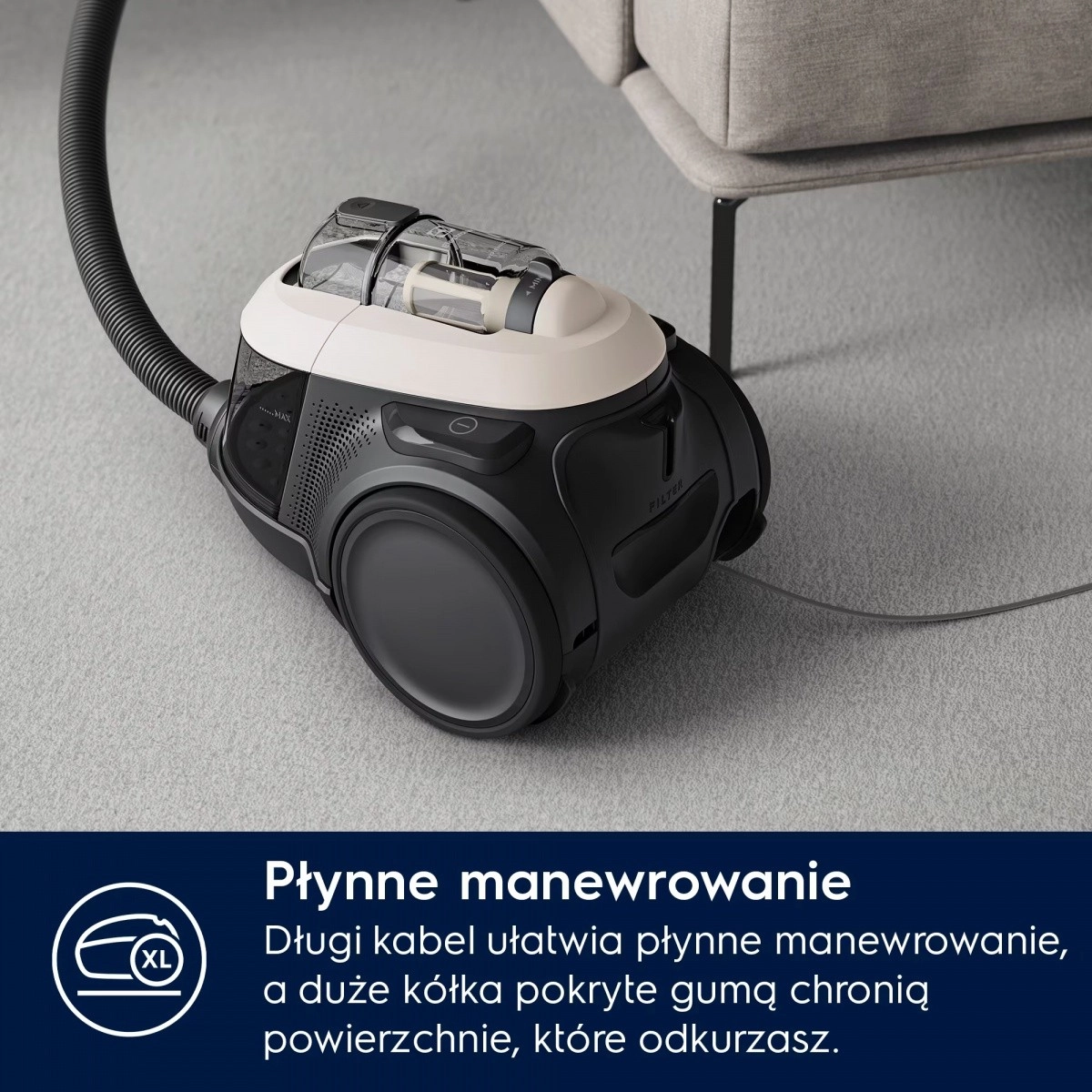 The compact bagless vacuum cleaner Hygienic 600 EL61H4SW combines cyclone technology for stable suction power, quick two-step bin emptying, and HEPA filtration of up to 99.99% of fine particles. Thanks to its ergonomic design, large rubber wheels, and the option to store it upright or flat, it’s ideal for any household.