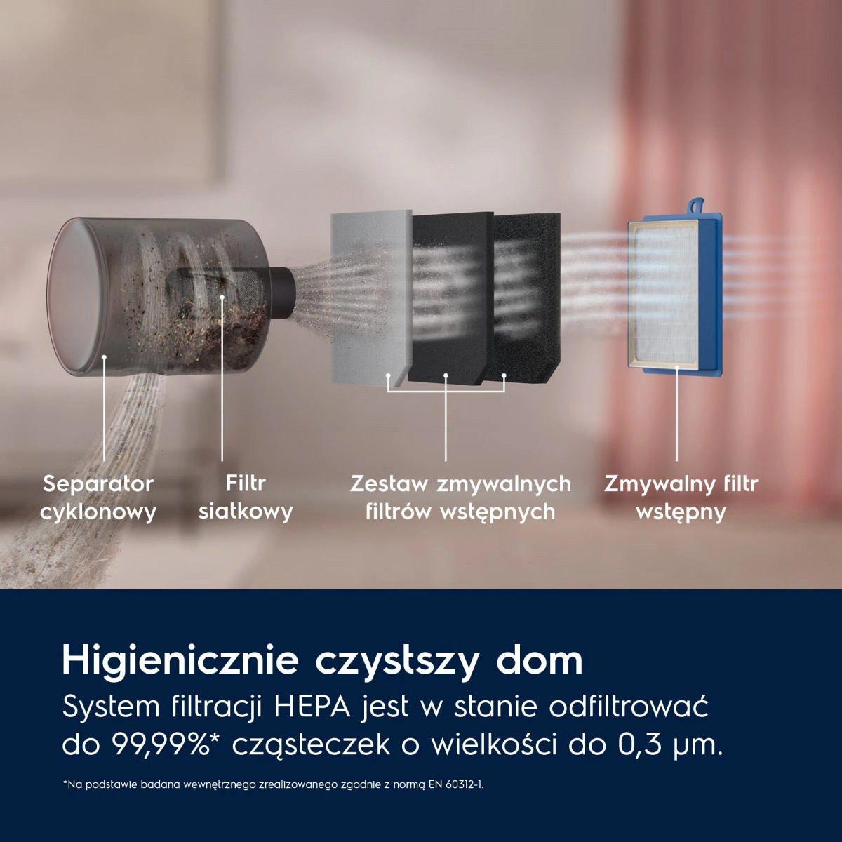 The advanced cyclonic system maintains consistent suction power even with a full bin and ensures efficient dust pickup on hard floors and carpets. The HEPA filtration system captures up to 99.99% of particles as small as 0.3 µm—fine dust, mites, and allergens—for cleaner air at home.