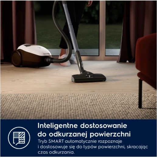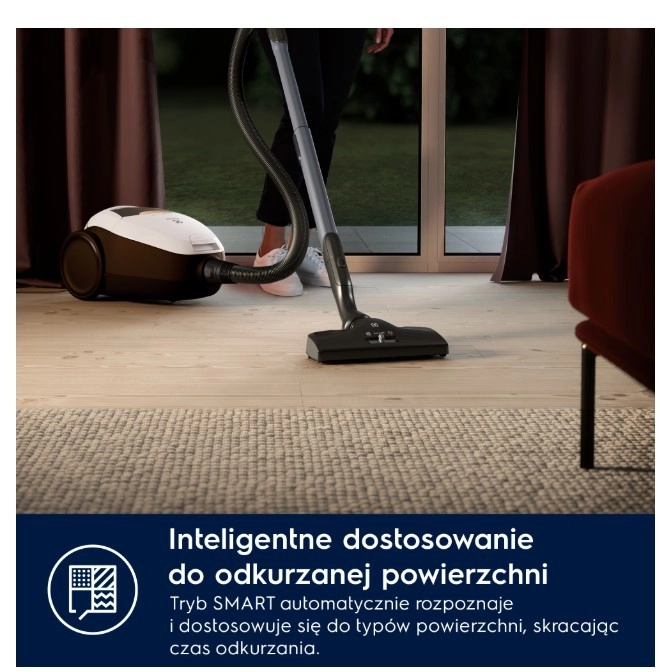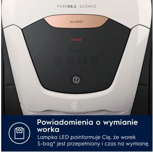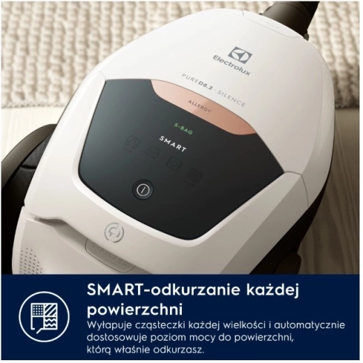 PURE D8.2 SILENCE is among the quietest traditional bagged vacuum cleaners – with the innovative PureSound system it reaches only 57 dB(A). Thanks to automatic SmartMode control, it detects the surface type and adjusts the power, so you can smoothly move from hard floors to carpets without manual settings.