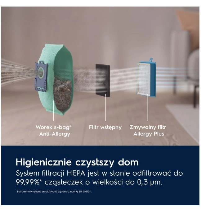 The newly developed OneGo Power Clean nozzle efficiently picks up both fine and larger debris on various surfaces. The high-quality washable HEPA filter captures up to 99.99% of particles sized 0.3 μm – dust, mites, and allergens – for a hygienically clean home and fresher air.