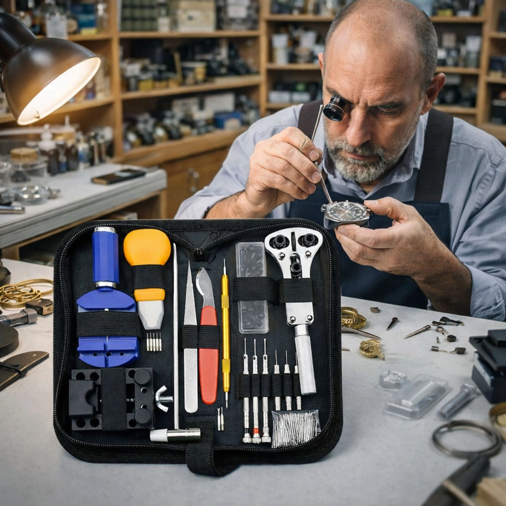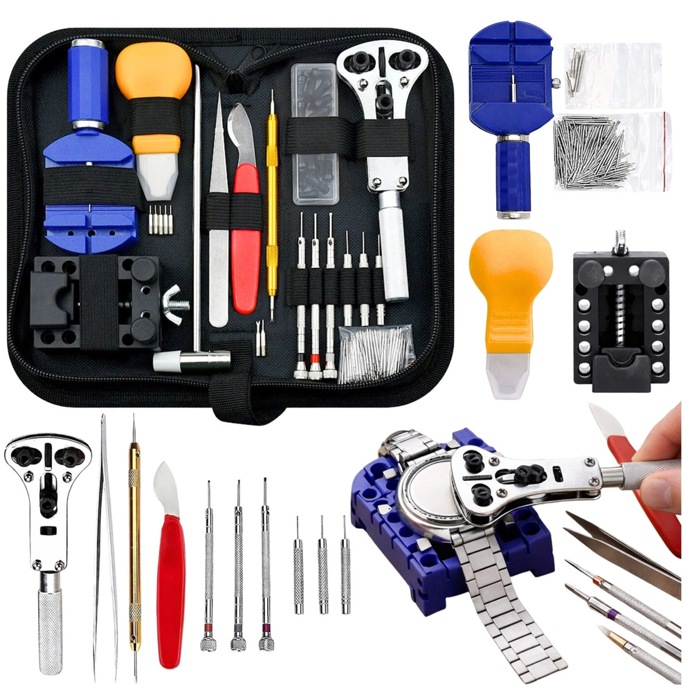 A complete watch repair and maintenance kit offering everything you need for home and advanced watchmaking tasks. Includes tools for opening case backs, shortening and adjusting bracelets, replacing spring bars, and securely holding watches. High-quality tools made of stainless steel and aluminum are stored in a practical zippered case for easy organization and transport.