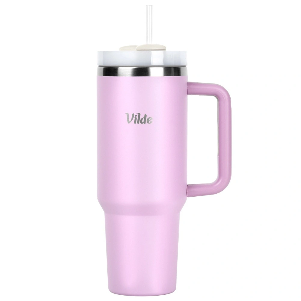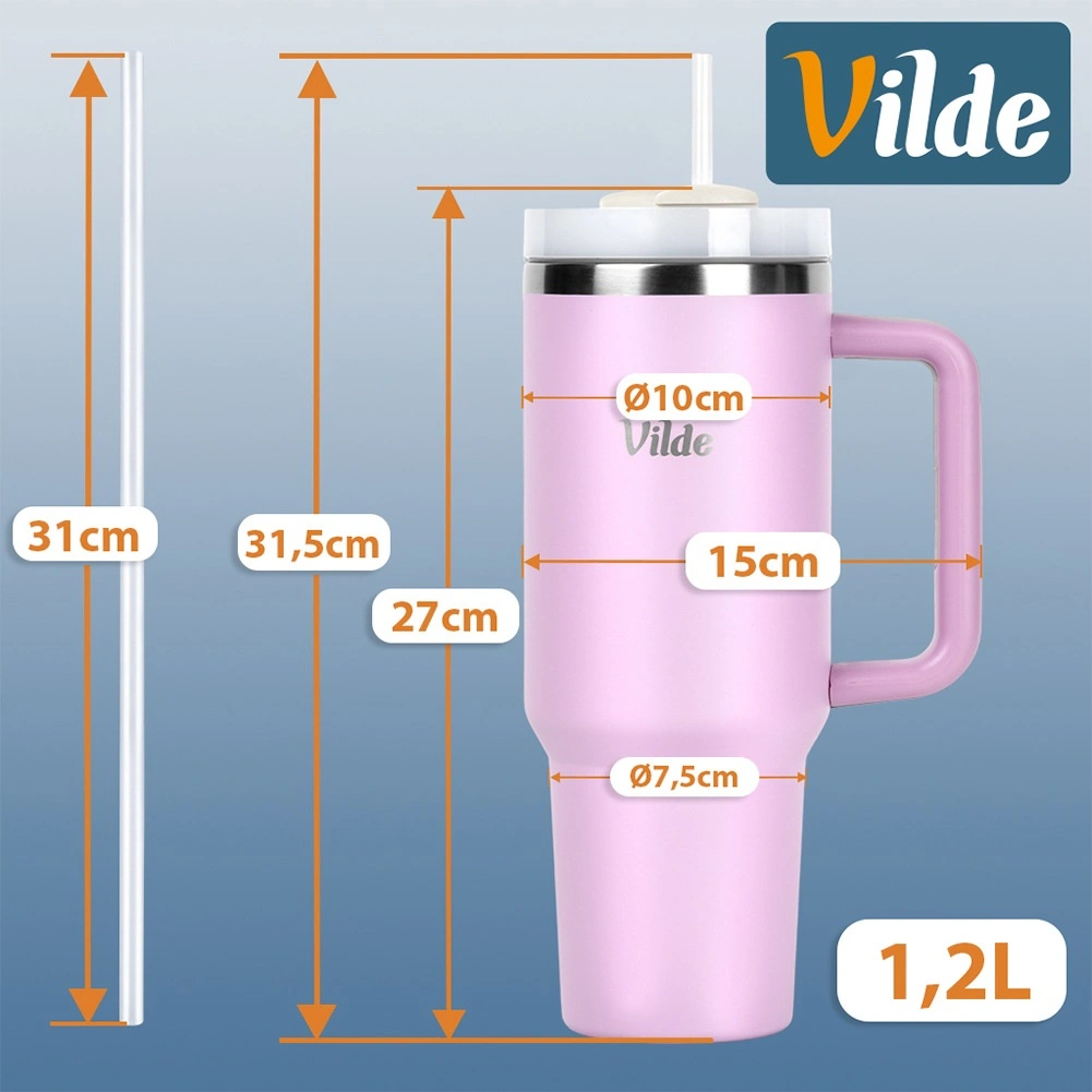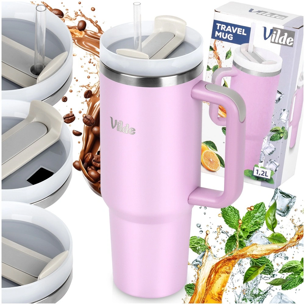 High-capacity 1.2 l thermal mug with a vacuum double wall keeps drinks hot for up to 12 hours and cold for up to 8 hours. It has an ergonomic handle with anti-slip elements, a lid with a twist closure, and the option to drink through a straw or from an opening without a straw. The stainless steel body in pink is durable and safe for everyday use at home, at work, and on the go.