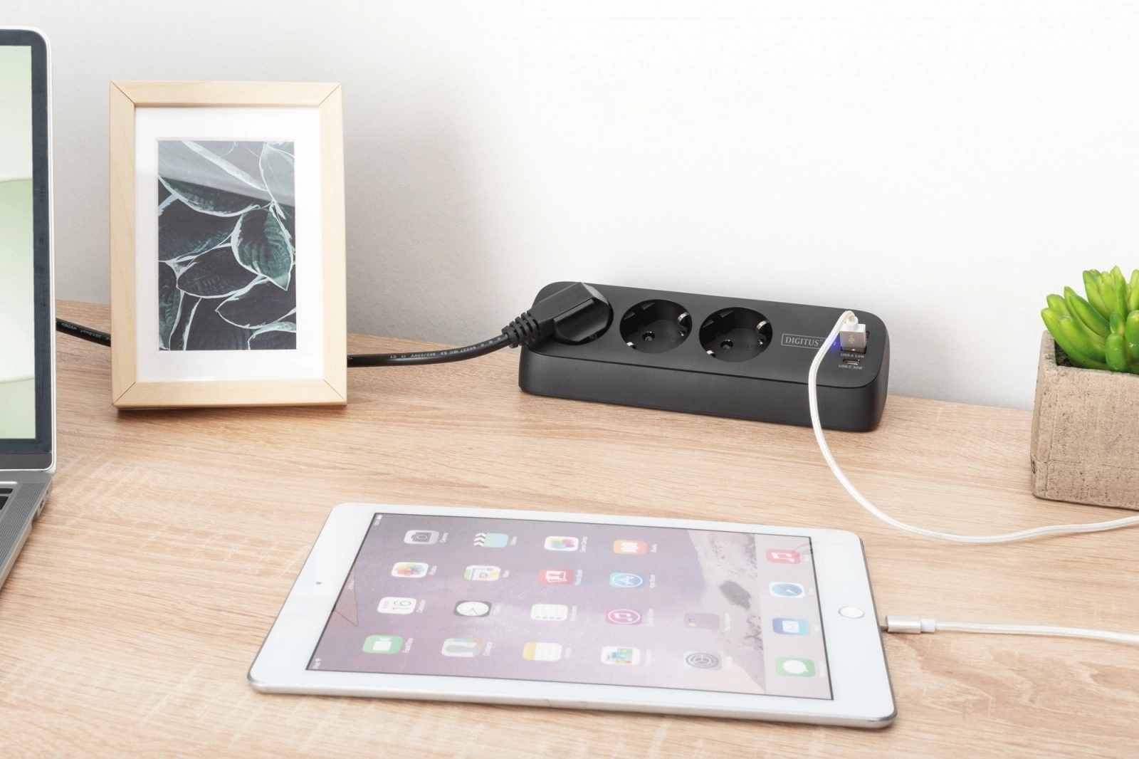 A practical desktop extension strip with 3 Schuko sockets and integrated charging via USB-A (2×12 W) and USB-C (30 W) for fast power to your phone, tablet, and accessories. Thanks to the desk clamp mount, you can install it easily and without drilling exactly where you need it. Includes short-circuit, overheat, and surge protection for safe operation in a home office or workplace.