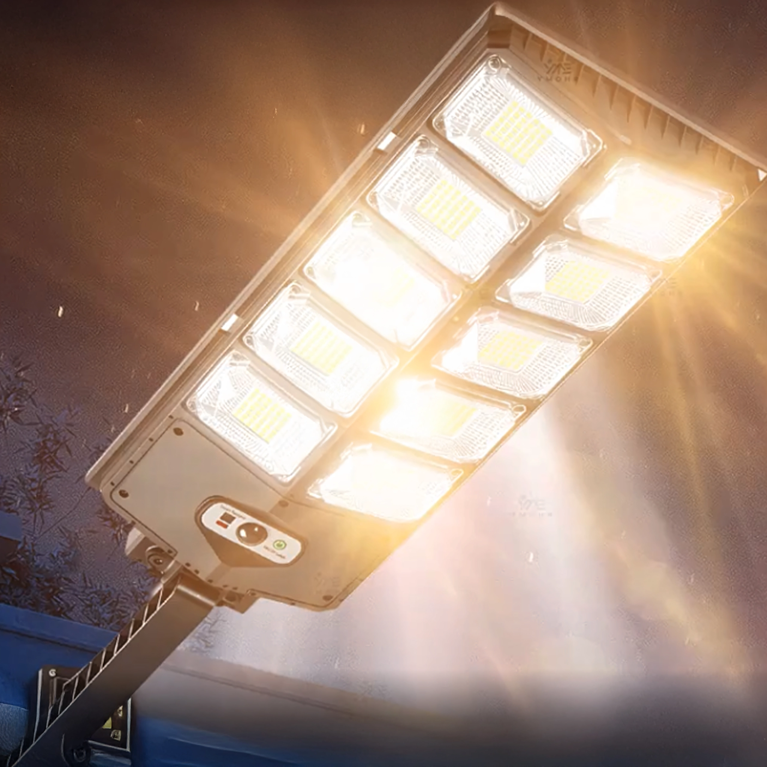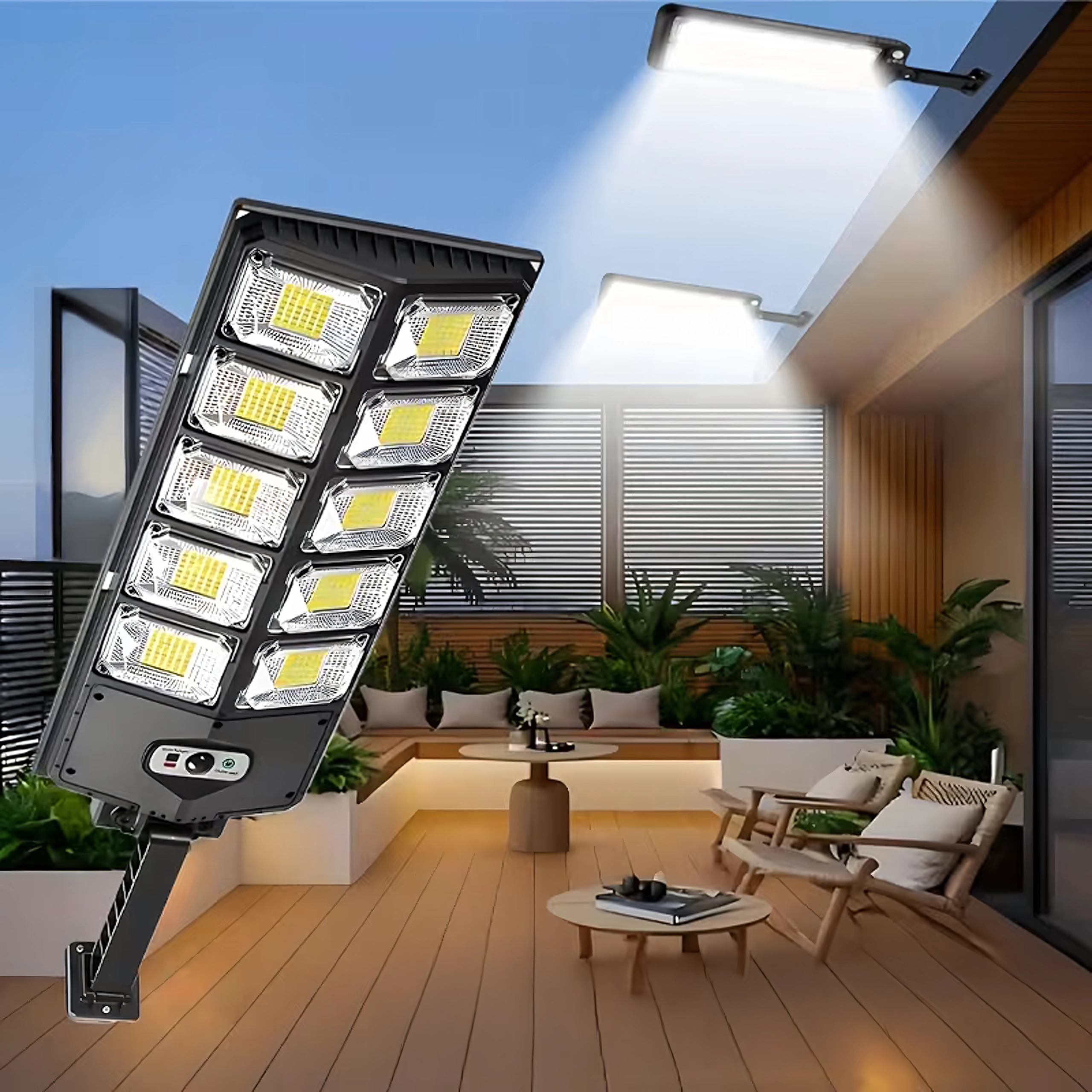 Solar LED outdoor lamp with motion and dusk sensor, remote control