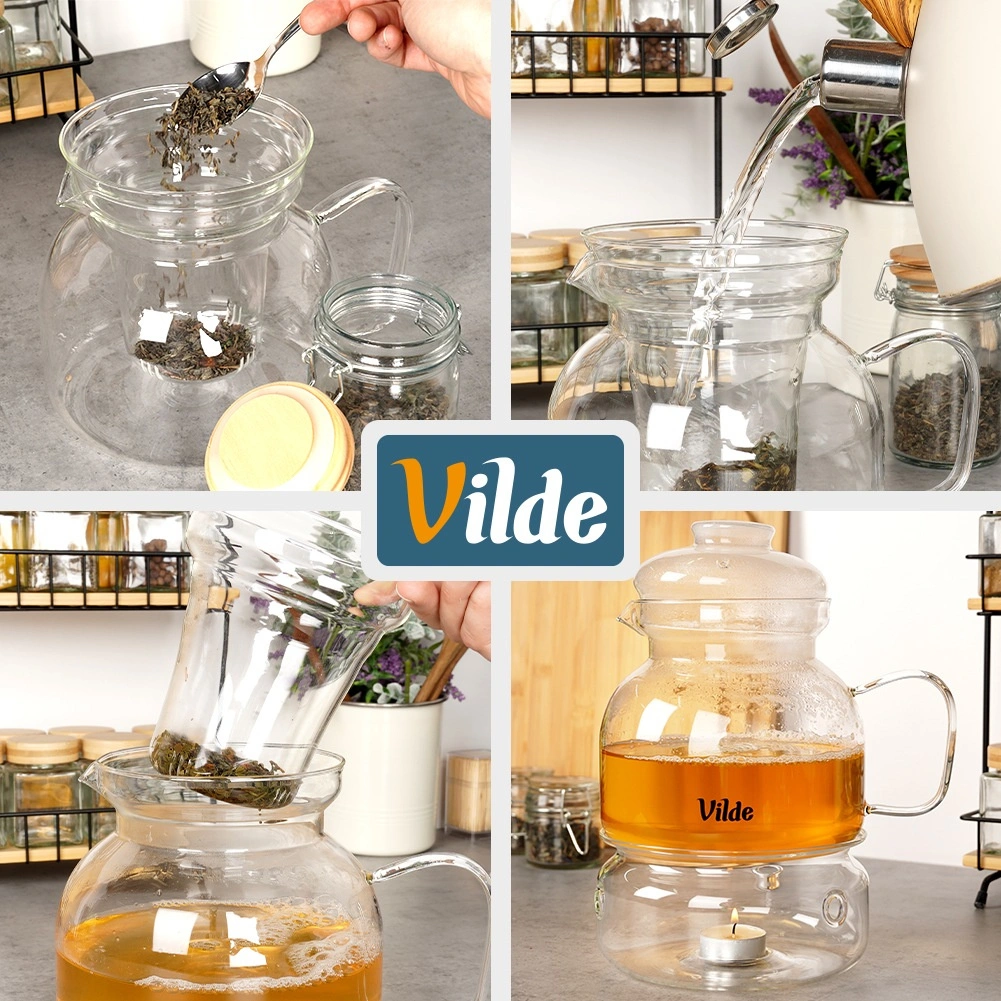 The entire set – teapot, filter, and warmer – is made of heat-resistant borosilicate glass, durable from -20 °C to 150 °C. Great for hot and cold beverages.