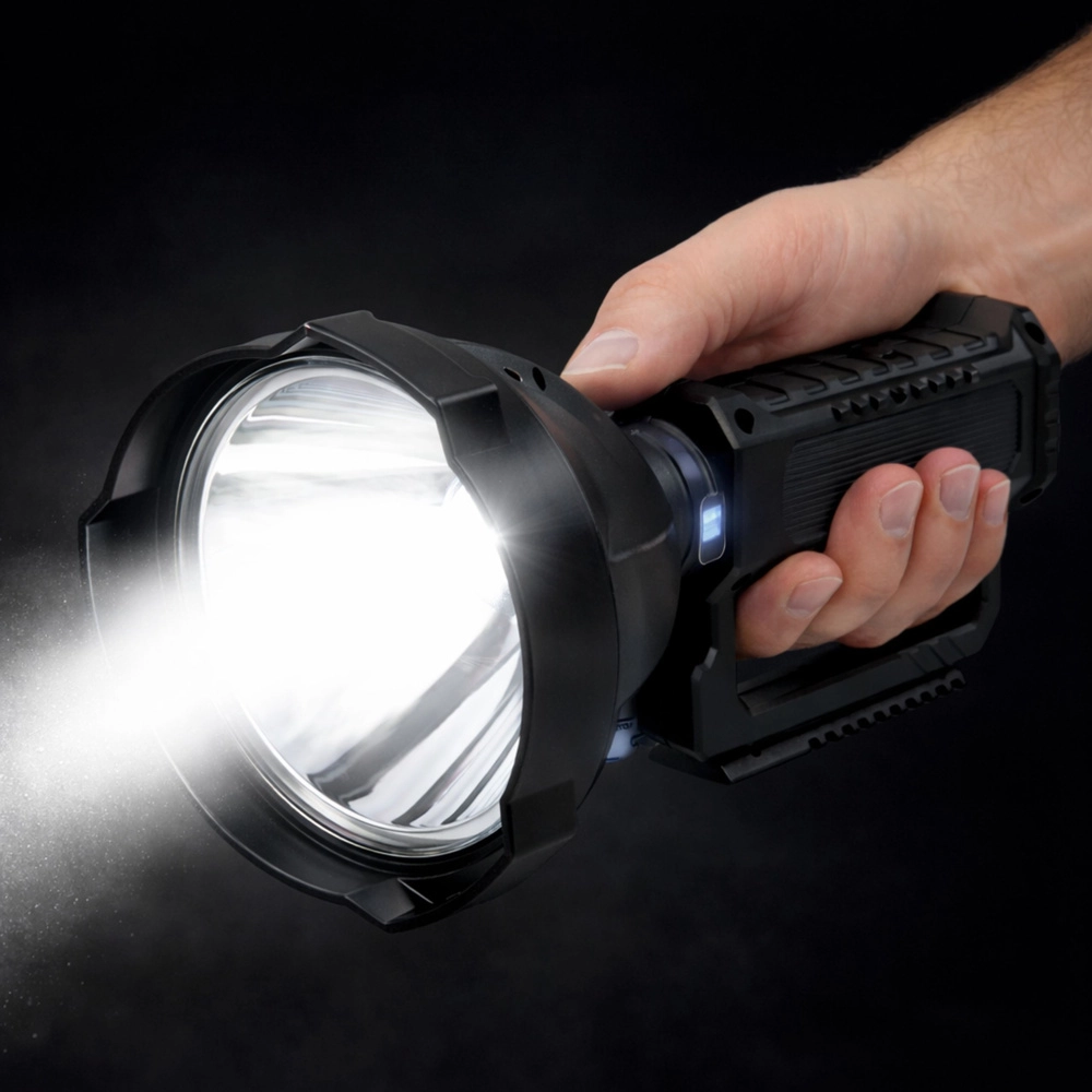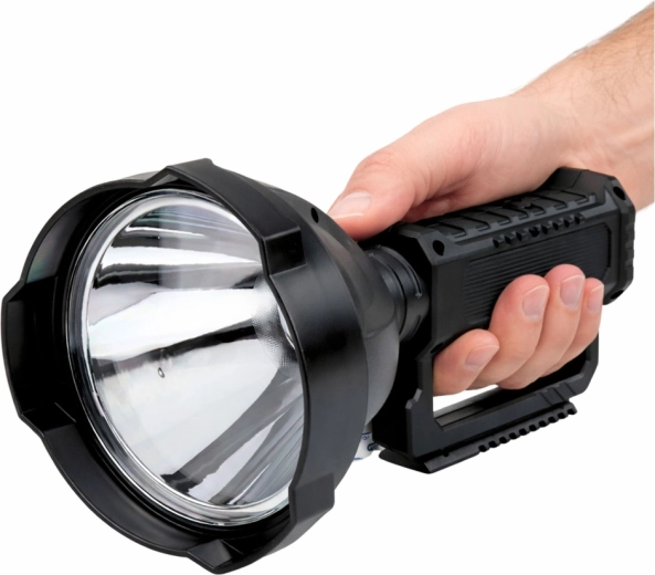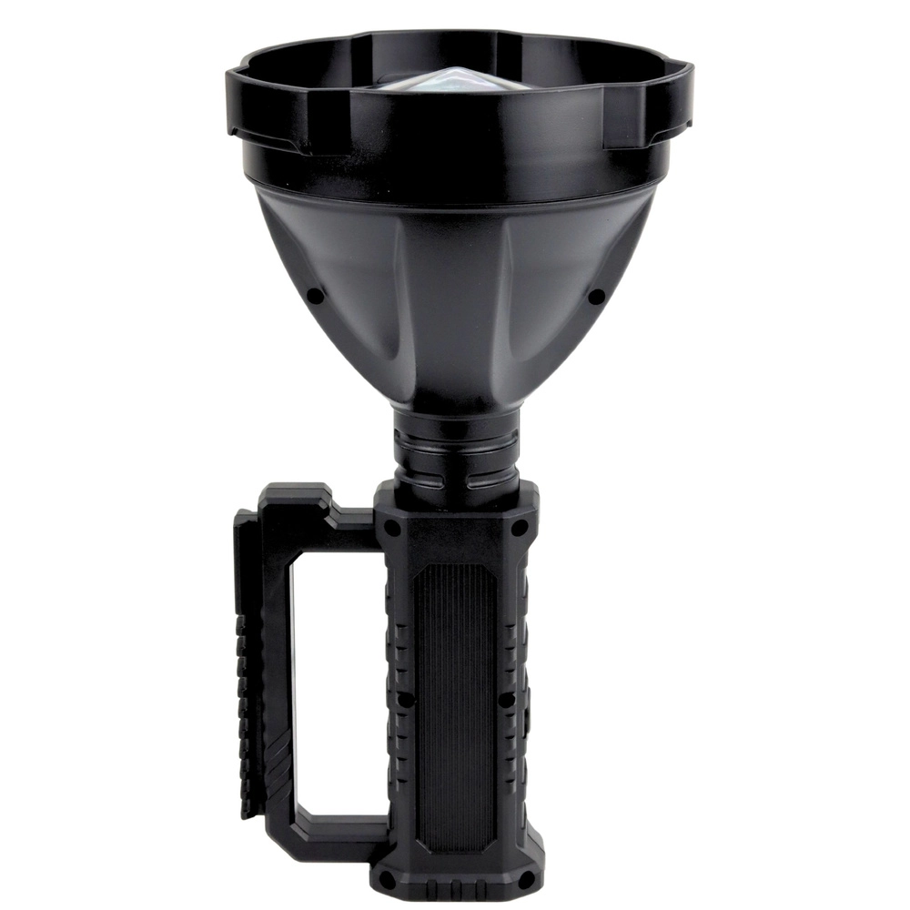 The large parabola and deep reflector create a narrow, long‑range light cone—ideal for searching, field work, and night activities.