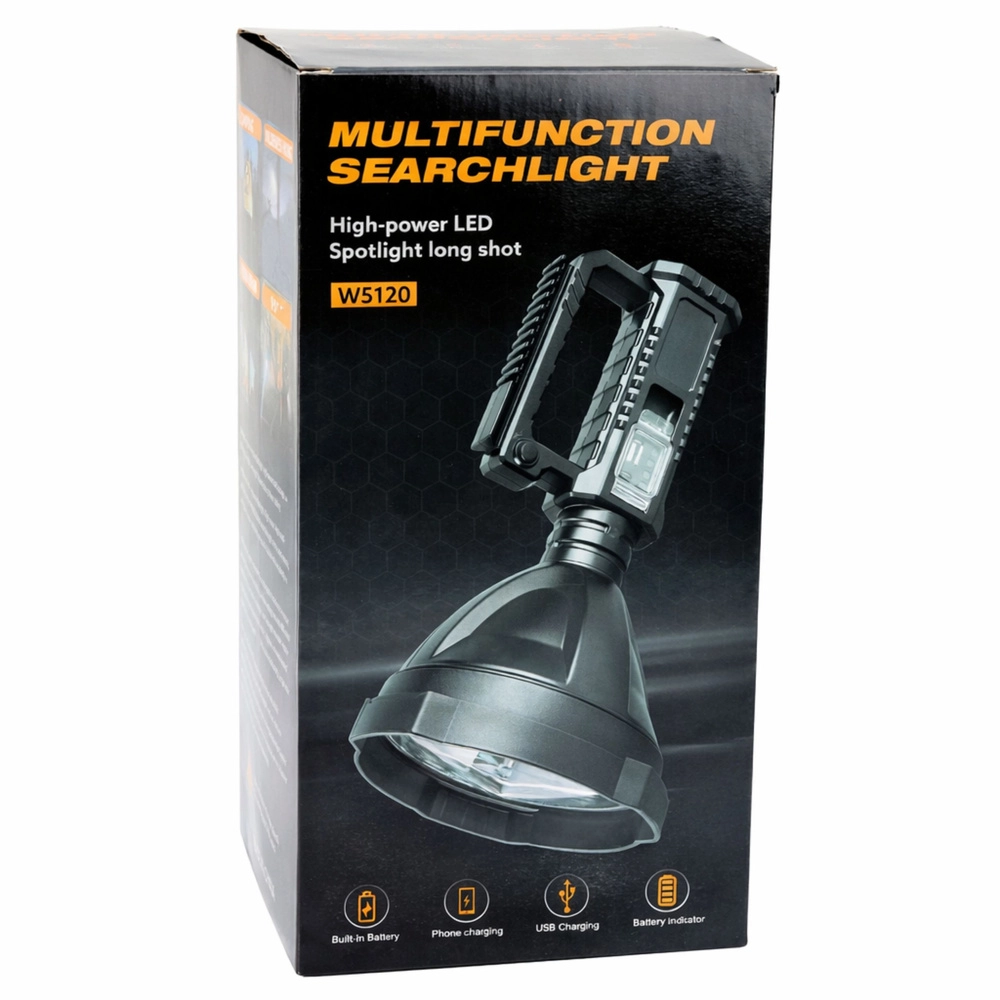 The spotlight has a built‑in rechargeable battery with USB charging and a handy power bank function for emergency phone charging. IPX5 water resistance protects against rain and splashes. An ergonomic handle and robust construction ensure comfortable grip and long service life.
