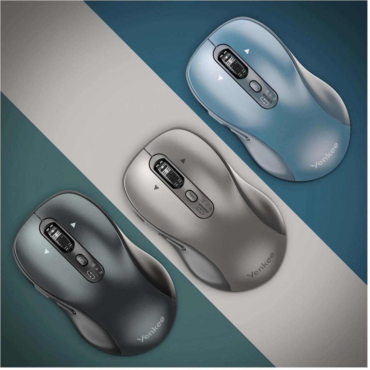 The YENKEE GYRO wireless mouse combines Bluetooth 5.1 and a 2.4 GHz USB receiver for smooth switching between up to 3 devices. It offers 4 DPI levels (1000–3200), silent switches, a precise optical sensor, and smart Smart Flying Scroll plus 4-way scrolling for higher productivity.