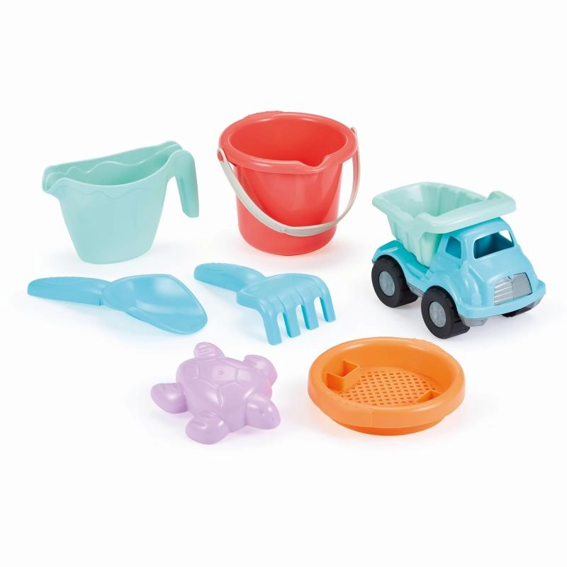 - Complete kit – bucket with sieve, shovel, rake, watering can, mold, and toy car