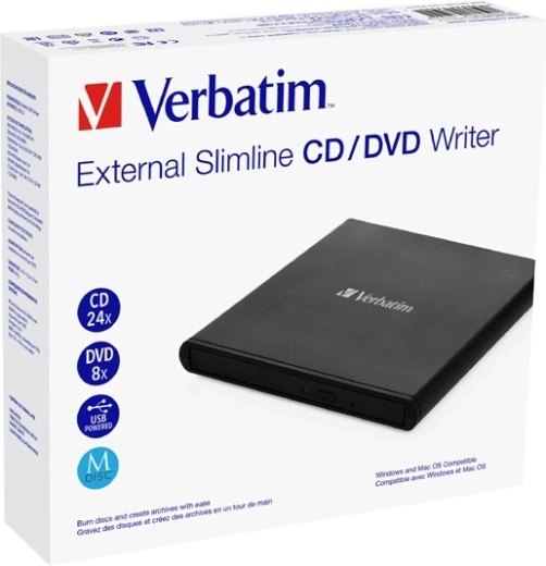Compact and lightweight external VERBATIM CD/DVD writer with USB 2.0 interface, ideal for laptops and ultrabooks without an optical drive. Supports M-DISC for long-term archiving, a wide range of media, and offers reliable reading and writing without the need for external power. Thanks to its slim design, it’s great for travel and everyday use.