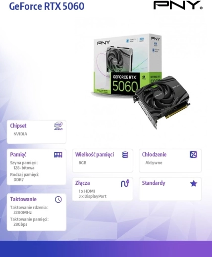 The PNY GeForce RTX 5060 8GB delivers modern performance for gaming and creative work in a compact body. The NVIDIA Blackwell architecture ensures efficient power use, faster ray tracing, and top-notch image quality thanks to DLSS 4. With the NVIDIA Studio ecosystem, you get drivers and optimizations for the most popular creative apps.