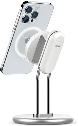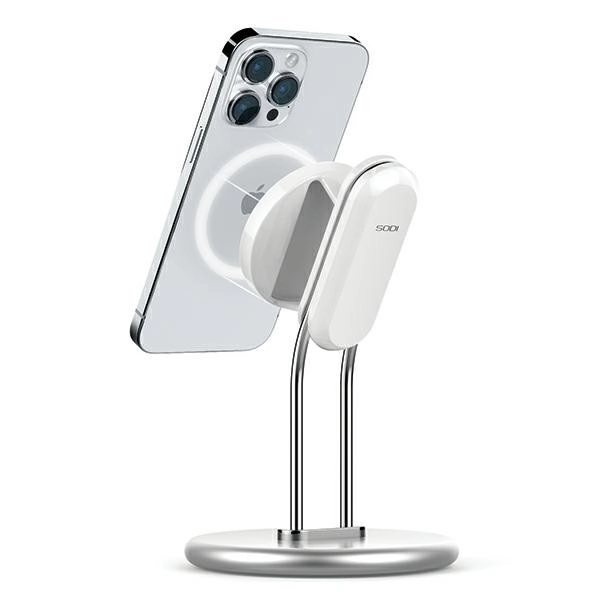 An elegant magnetic stand made of aluminum alloy with a detachable holder offers solid stability, MagSafe compatibility, and comfortable hands‑free viewing of videos, games, and video calls. Soft silicone pads protect the table, the adjustable angle ensures great viewing angles, and the replaceable magnetic plate lets you insert the original MagSafe wireless charger (not included).