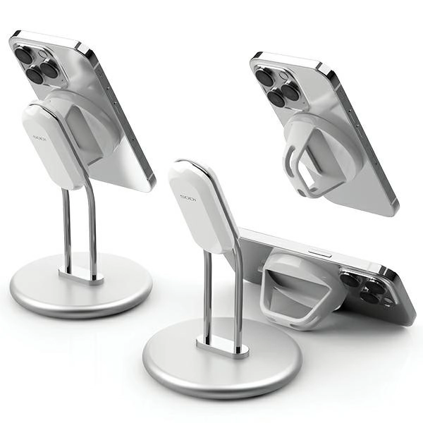 This premium desktop stand, inspired by clean architecture, combines an aluminum build with finely brushed edges and a pleasant metallic sheen. The magnetic head securely grips your phone, while non-slip silicone pads keep the stand in place and protect your desk from scratches.