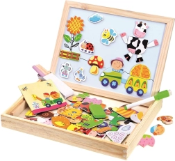 The Bino Farm Magnetic Drawing Board is a versatile two-sided board featuring delightful farm themes. One side is magnetic, allowing kids to write with a marker and attach thematic characters and various shapes. The other side is a slate, perfect for chalk writing, which can be easily erased.