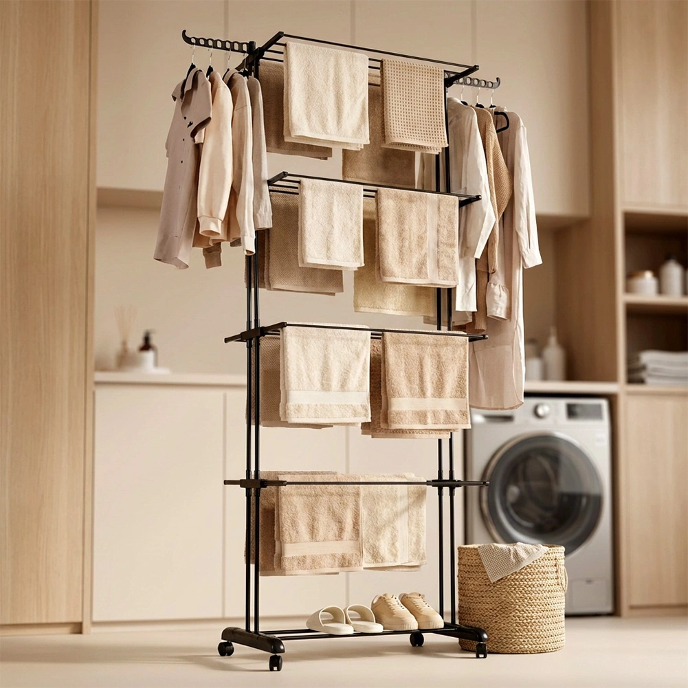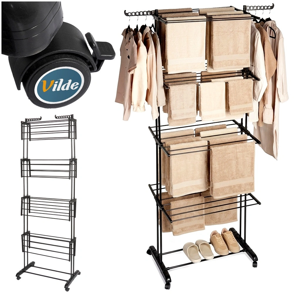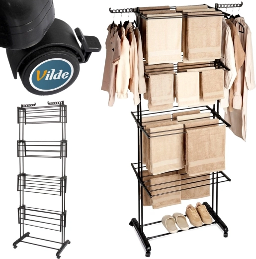 A practical vertical laundry drying rack with four levels offers up to 22.7 m of drying space, a stable metal frame, and wheels with brakes for easy moving. Thanks to the foldable wings, side arms for hangers, and a bottom shelf for shoes, it makes the most of space at home or on the balcony.