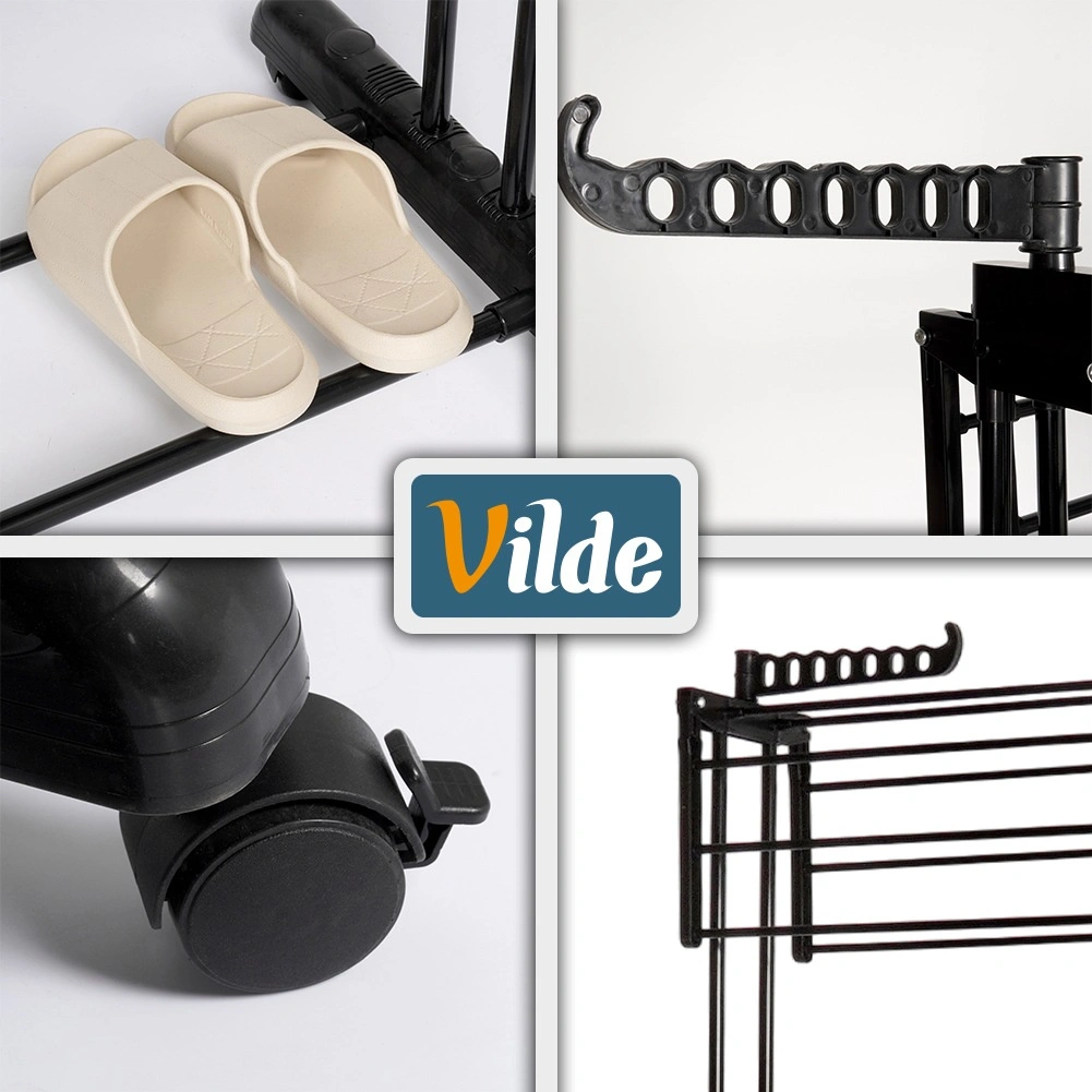 The durable powder-coated metal frame is stable and moisture-resistant, making the rack suitable for both indoor and outdoor use (balcony, terrace, garden). Four wheels ensure easy handling, two of which feature a brake for secure positioning. The bottom shelf is perfect for drying shoes and accessories.