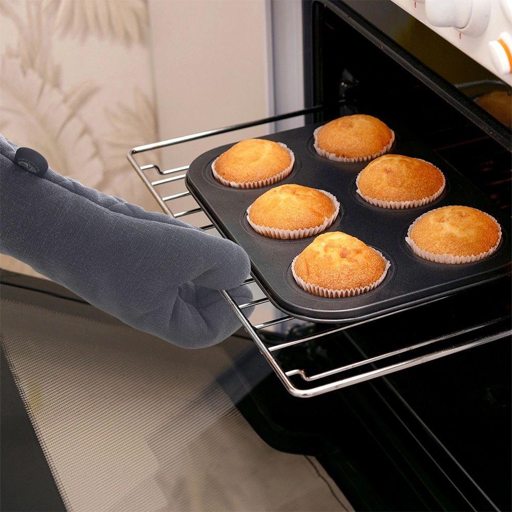 The thickly padded cotton construction reliably protects your hands when handling hot trays and cookware, while the thumbed shape ensures a secure grip.