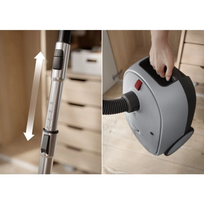 Convenient foot controls allow you to rewind the cable, turn on/off, and adjust power hands-free. Swiveling, highly maneuverable wheels ensure smooth movement across different floor types. The long 12 m reach minimizes switching between outlets. The model is designed with sustainability in mind—up to 50% of plastics are recycled, and documentation is printed on recycled paper.