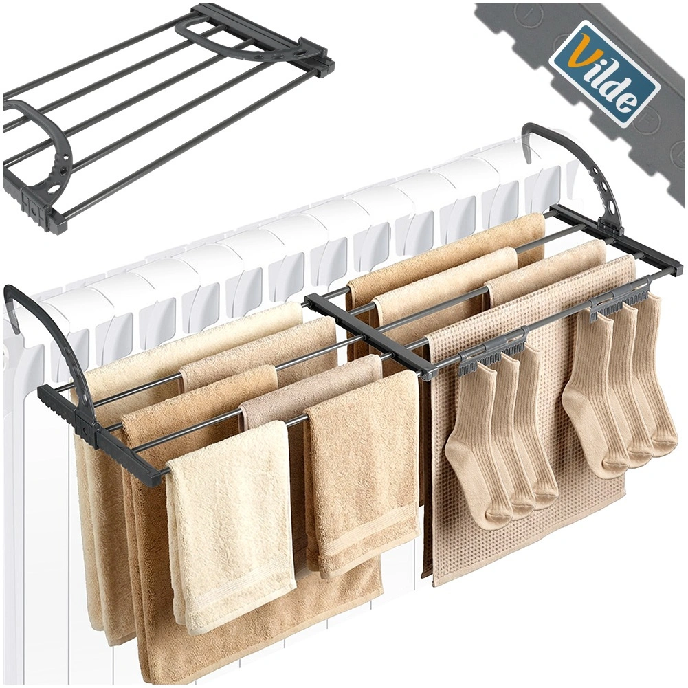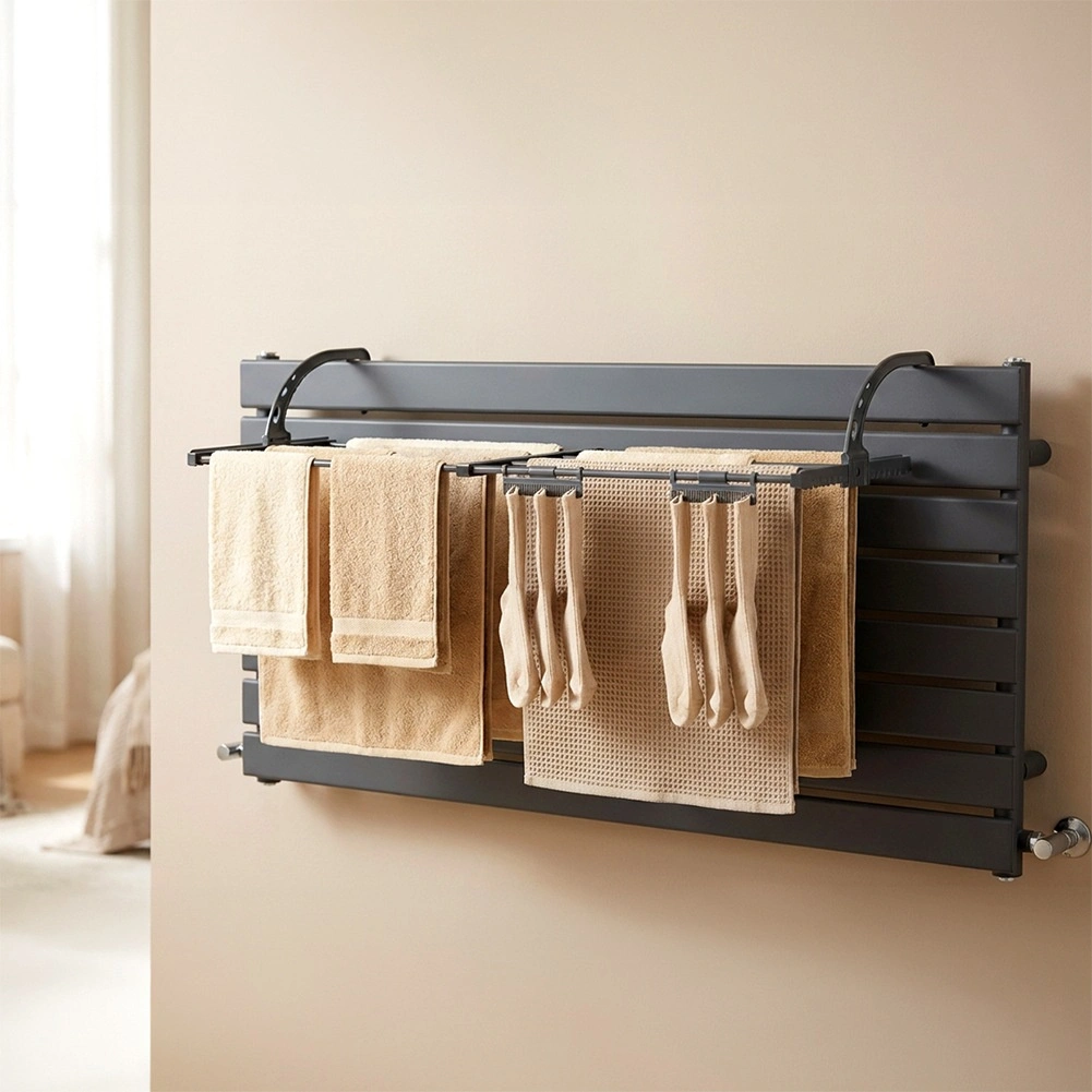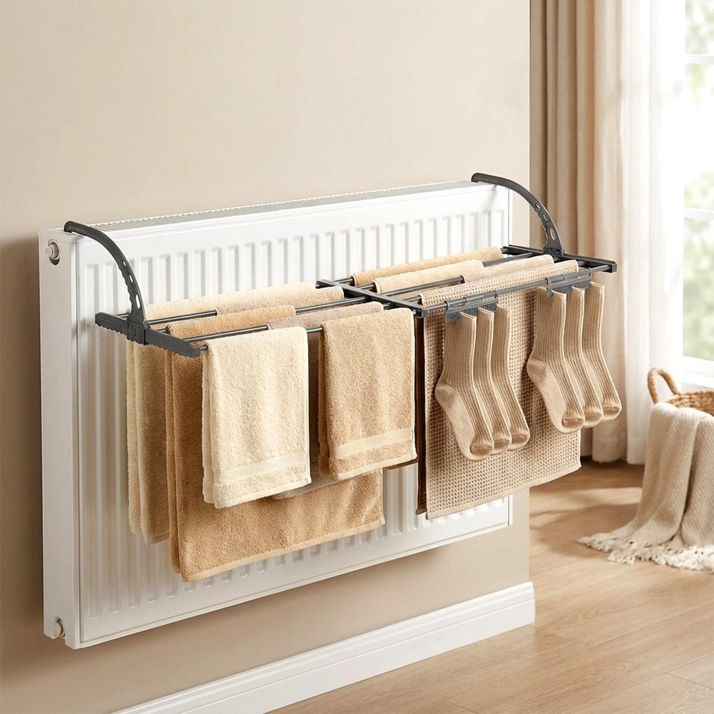 - Space-saving: mounts on radiator or railing, compact foldable design.