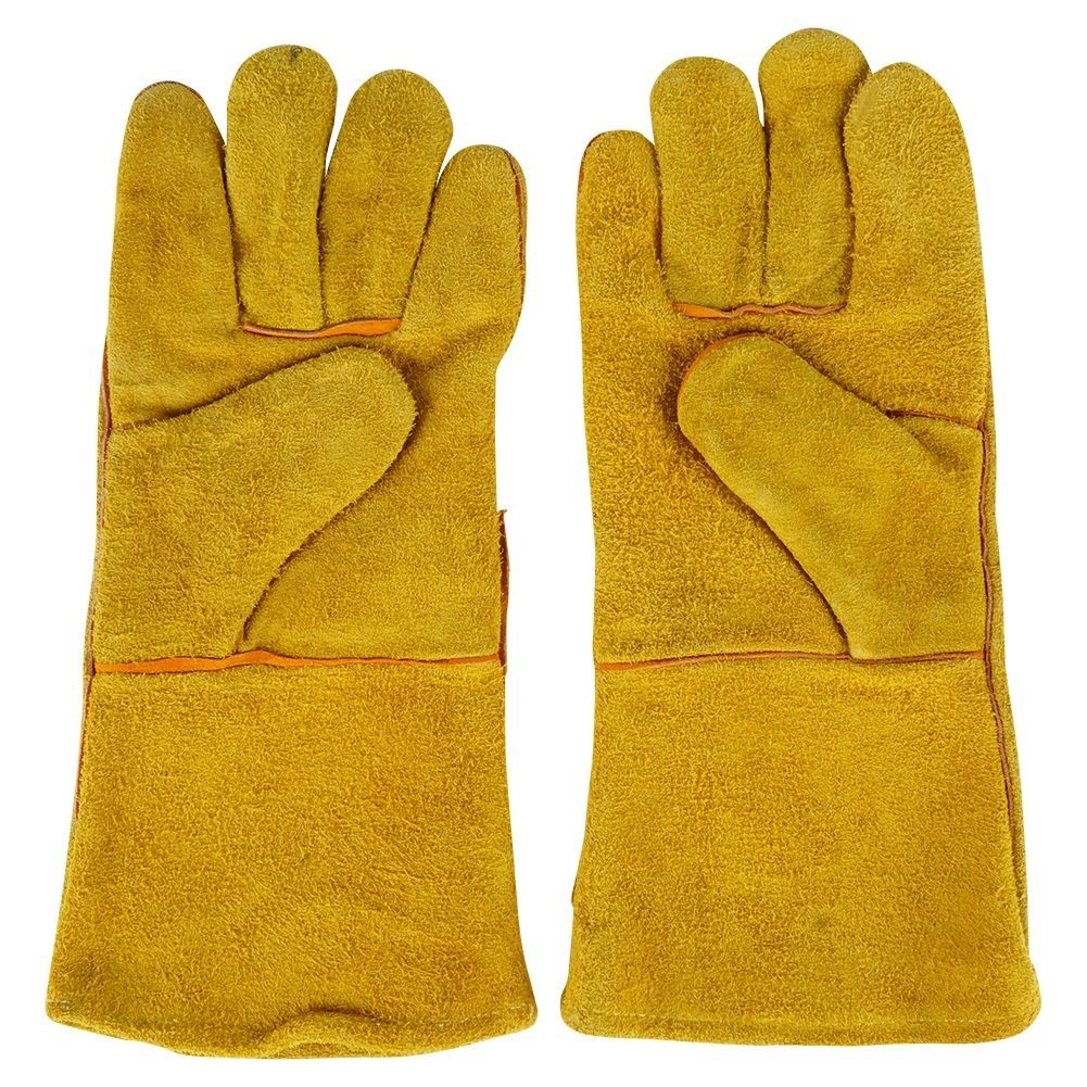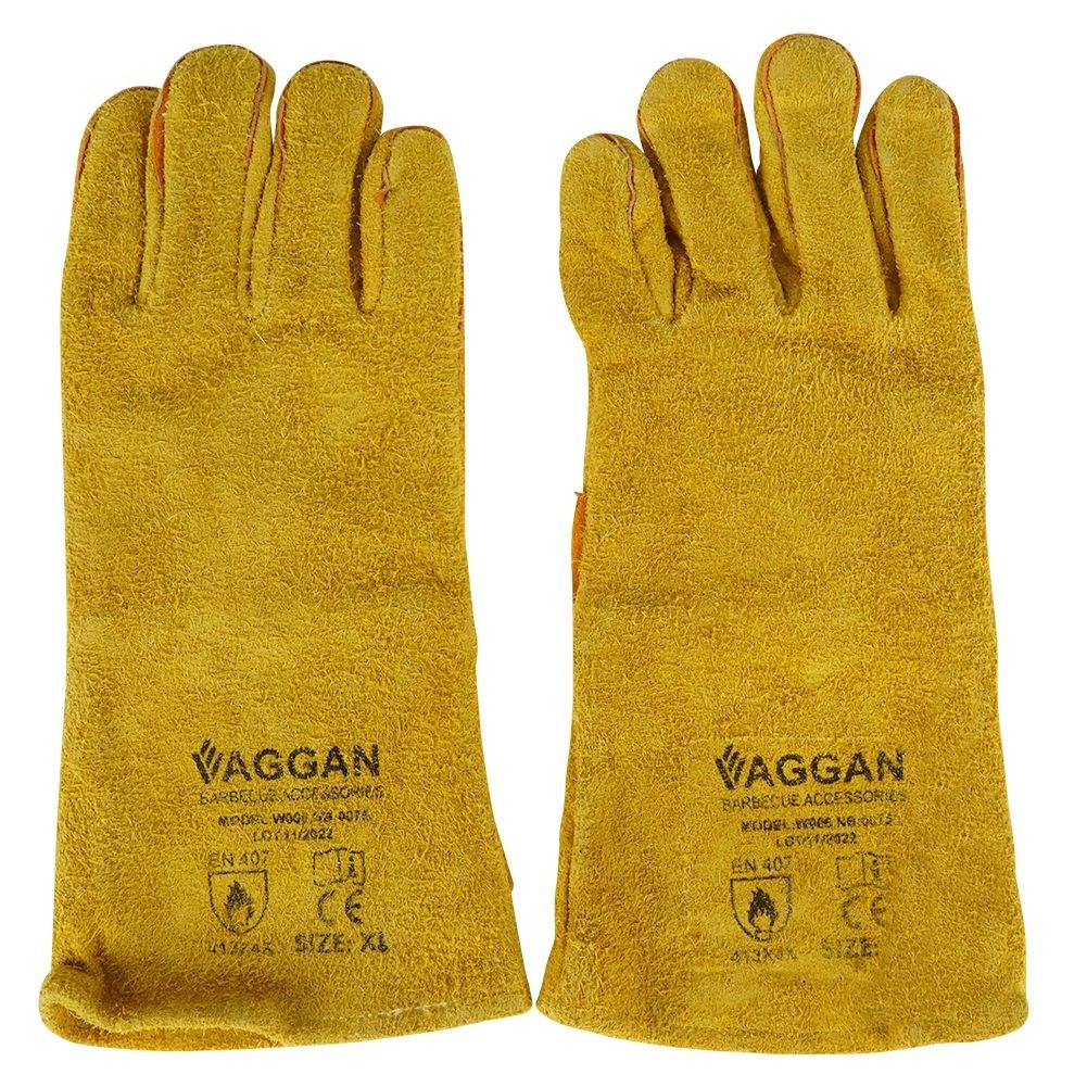 A pair of high-quality leather grilling gloves, 34 cm long and size XL, reliably protect hands and forearms from heat. Thanks to the inner fleece lining they are comfortable, and the soft mustard-tone leather is also resistant to high temperatures. They meet standard EN 407 and protection class BC, making them suitable for the grill, oven, and stovetop.