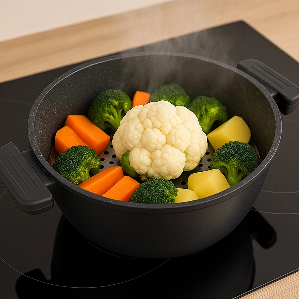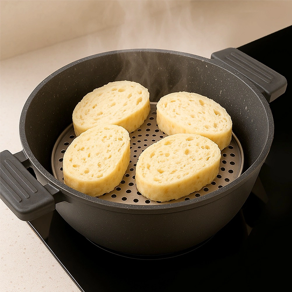 The thoughtful design with legs keeps the insert above the water line so steam can circulate freely and the food won’t burn or get soaked. The folding handle makes safe insertion and removal easy even during cooking. Ideal for vegetables, potatoes, fish, seafood, dumplings, and for gentle reheating without a microwave.