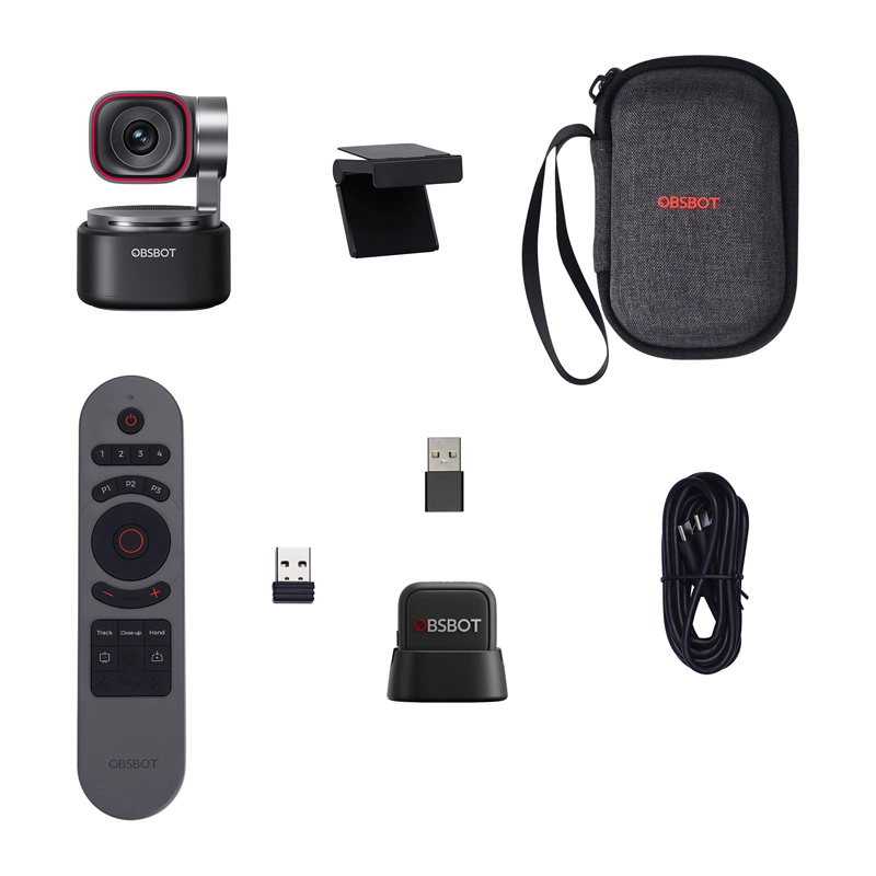 OBSBOT Tiny 3 webcam; OBSBOT Tiny Smart Remote 2; OBSBOT Vox SE microphone; Adjustable mount; USB‑C to USB‑C cable; USB‑C to USB‑A adapter; Case