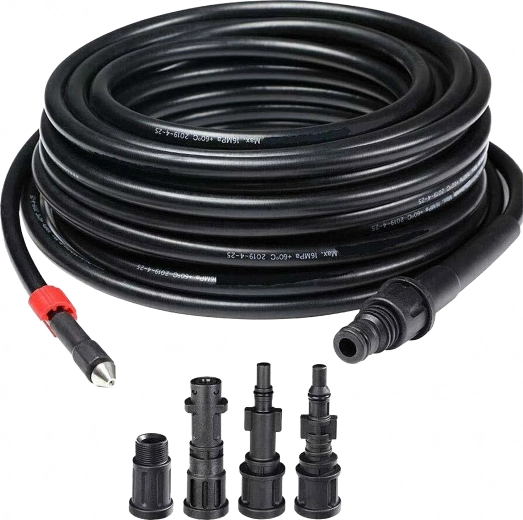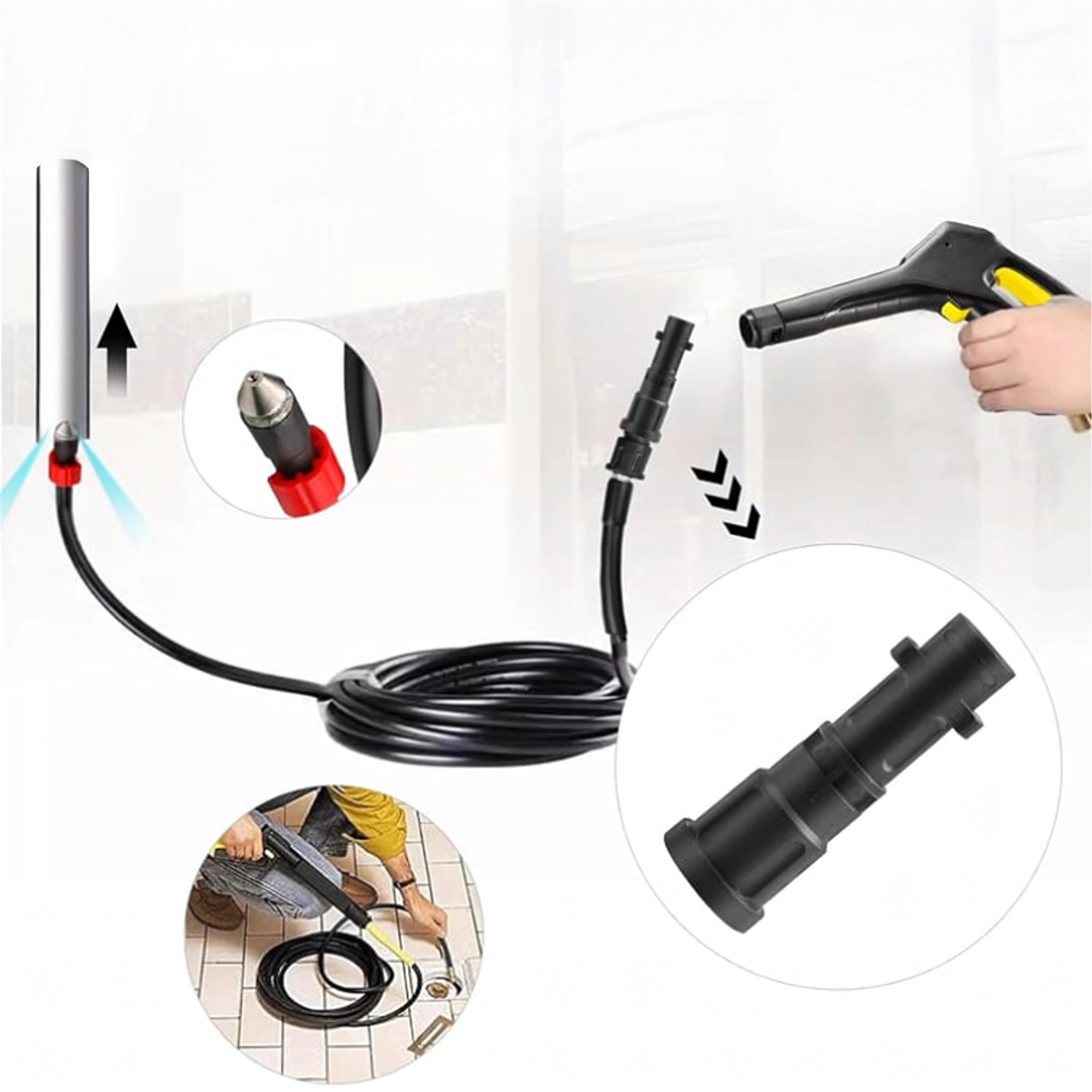 The package includes interchangeable adapters that broaden compatibility with various brands and types of pressure washers. The hose is designed to pass easily through bends and elbows, and with rear‑facing jets it agitates and flushes out debris.