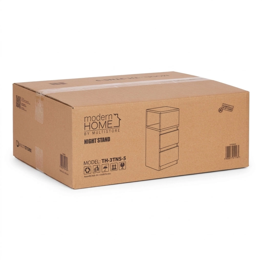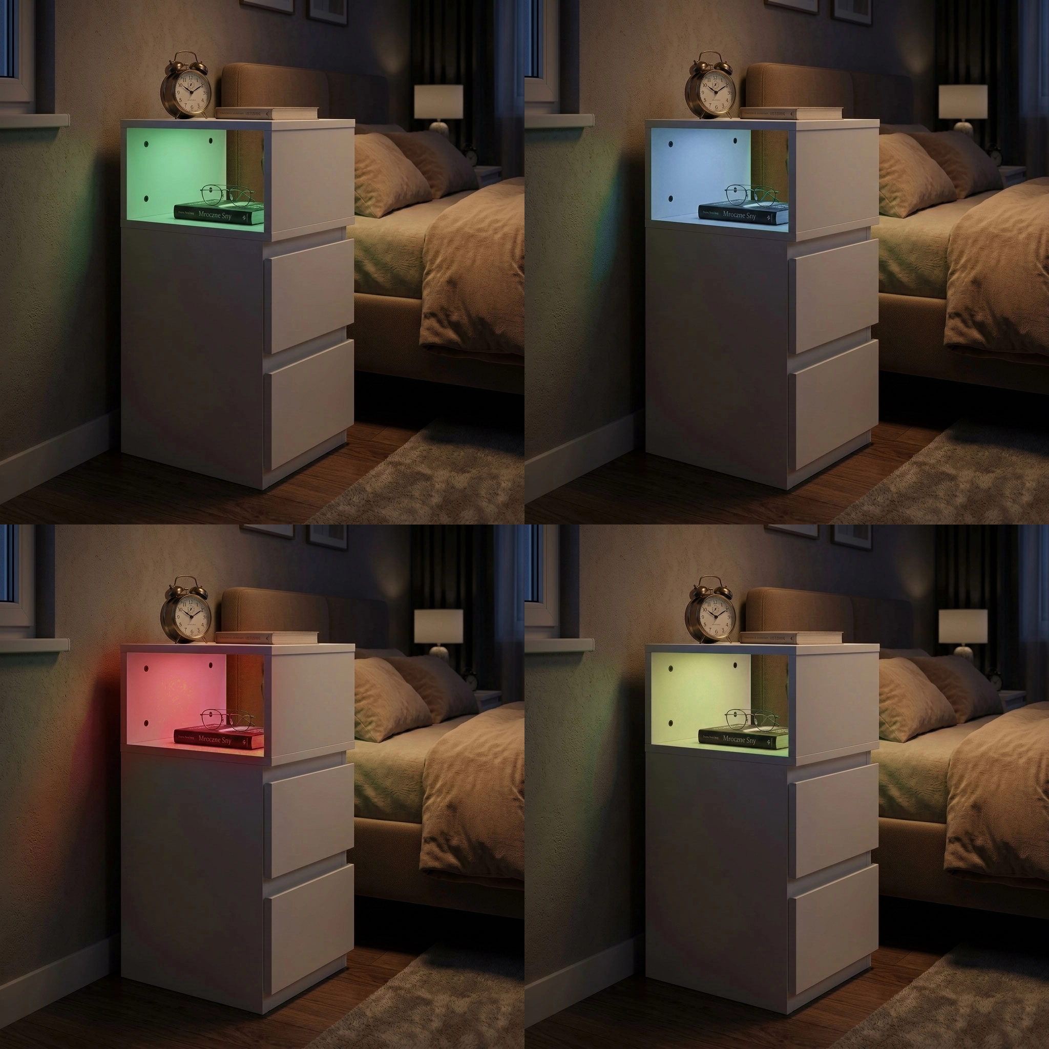 Elevate your bedroom ambiance with the stylish ModernHome nightstand. Integrated RGB LED backlighting in the open compartment sets a calm mood for reading and evening relaxation. Control is simple—use the remote control to choose from 16 colors and effects (Flash, Strobe, Fade, Smooth), while the mobile app provides an even broader palette and smooth brightness adjustment.