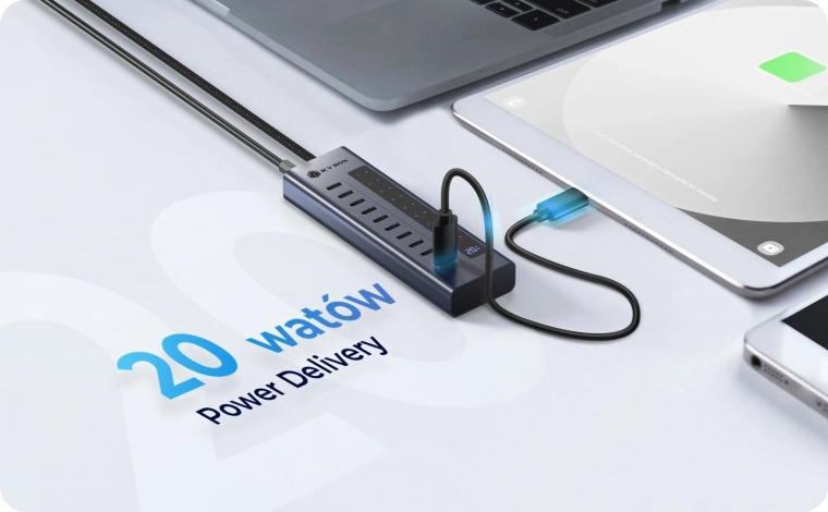 The unique dedicated USB-C port with 20 W Power Delivery supports both 10 Gb/s data and fast charging for your phone or tablet. The integrated LED display shows PD output power in real time, giving you instant insight into power draw at a glance.