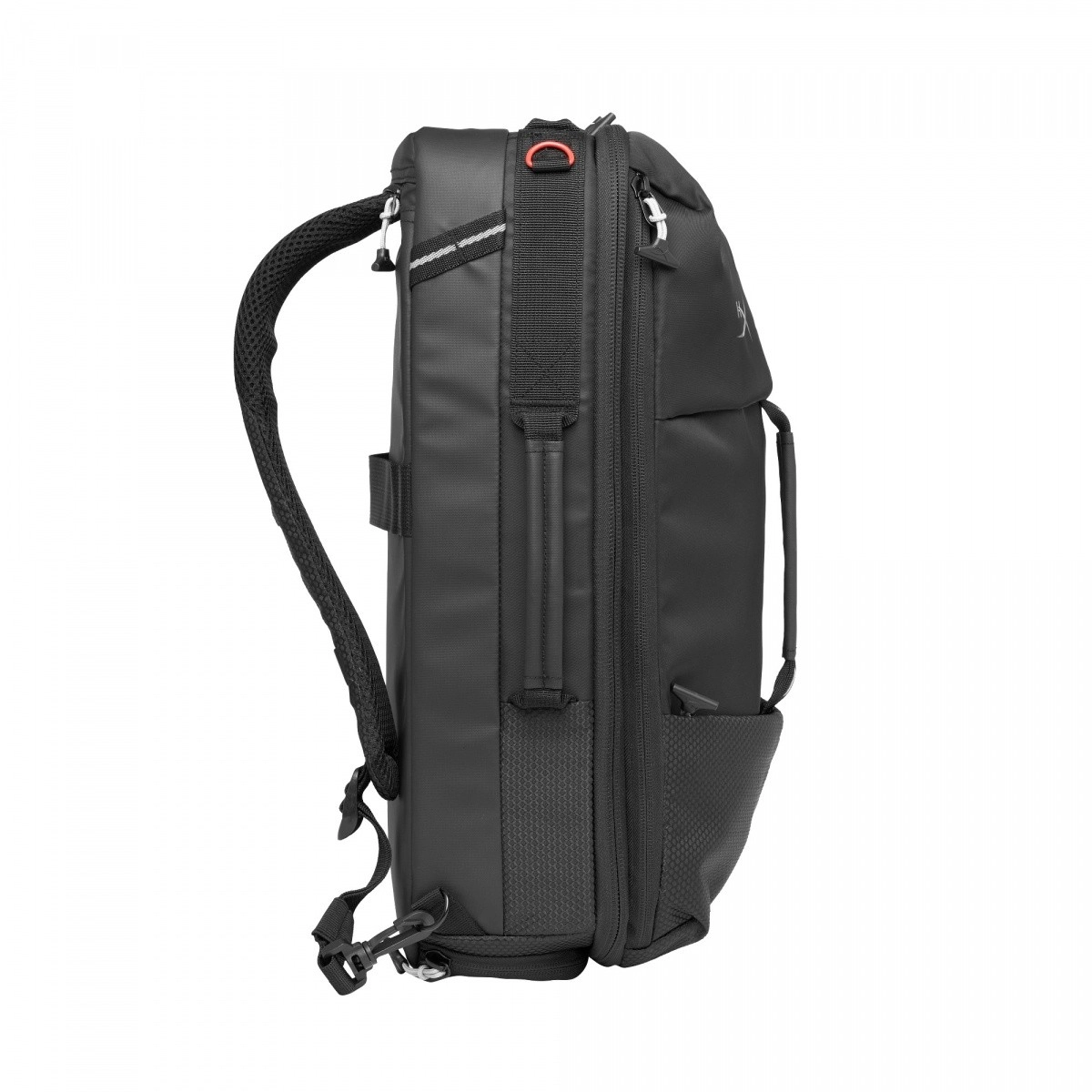 The durable construction made from partially recycled 600D polyester protects equipment from scuffs, tears, and bad weather. Padded shoulder straps, top and side handles, and a luggage pass-through provide multiple carrying options. The front quick-access pocket holds small items and snacks, while the internal organizer keeps cables and add-ons in order.