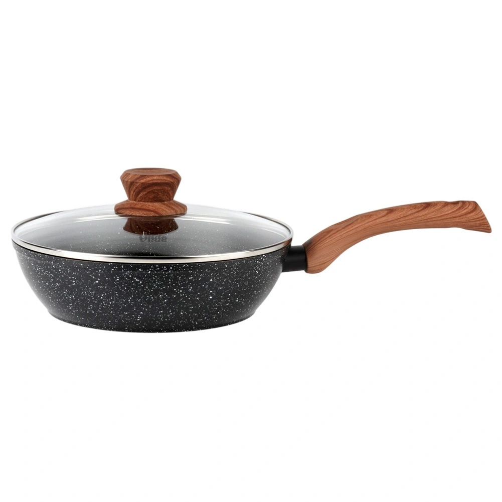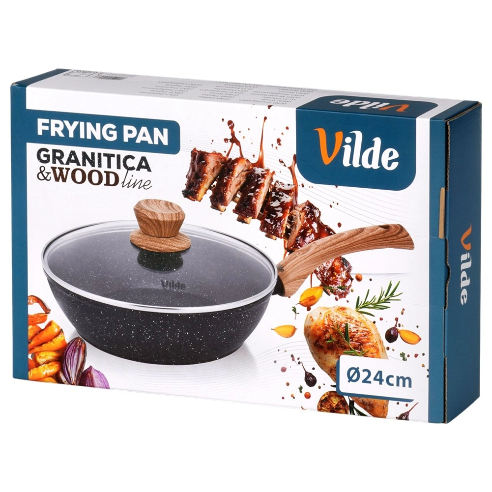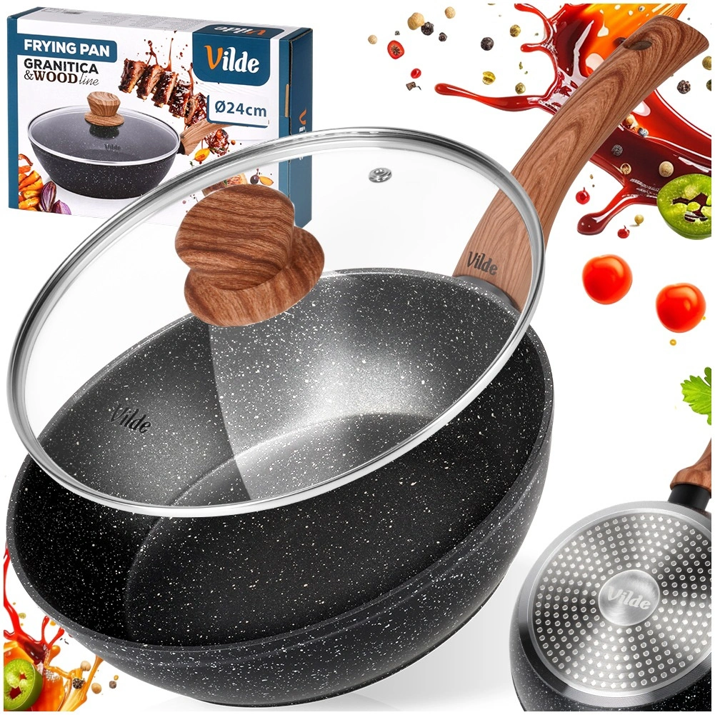 The deep GRANITICA WOOD 24 cm pan combines a durable aluminum body with a multilayer non-stick granite surface for even heat distribution and easy food release. The glass lid with a stainless steel rim and steam vent helps retain heat and juiciness.