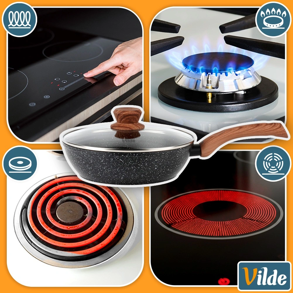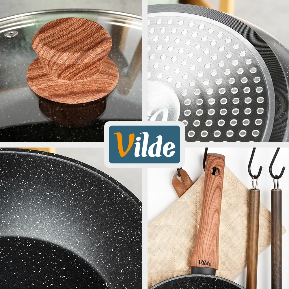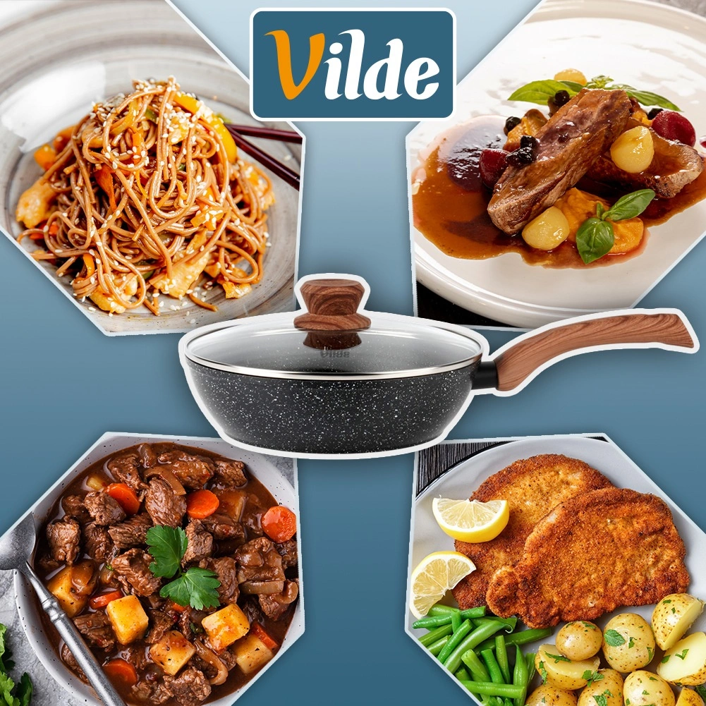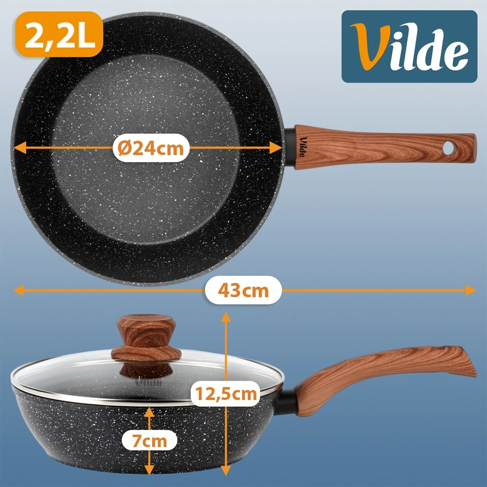 The deep GRANITICA WOOD 24 cm pan combines a durable aluminum body with a multilayer non-stick granite surface for even heat distribution and easy food release. The glass lid with a stainless steel rim and steam vent helps retain heat and juiciness.