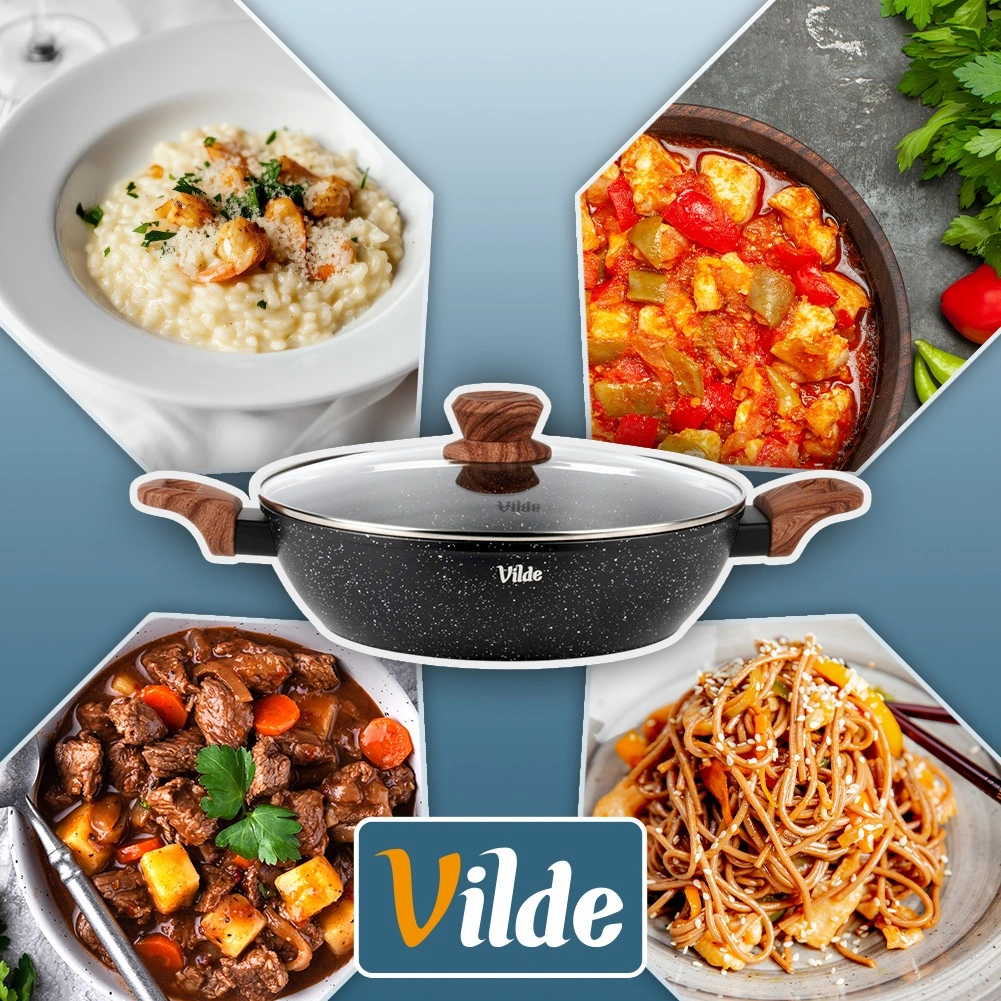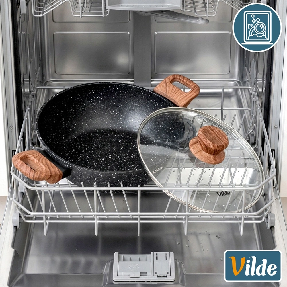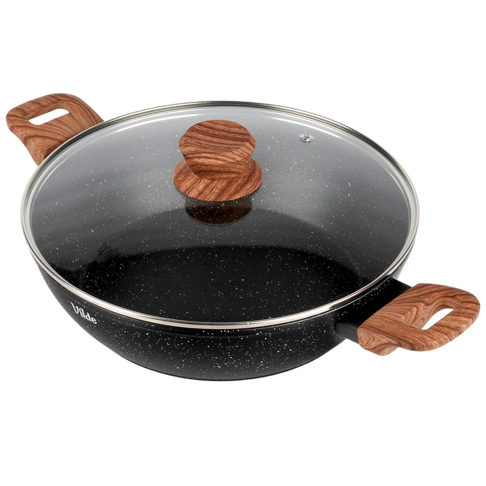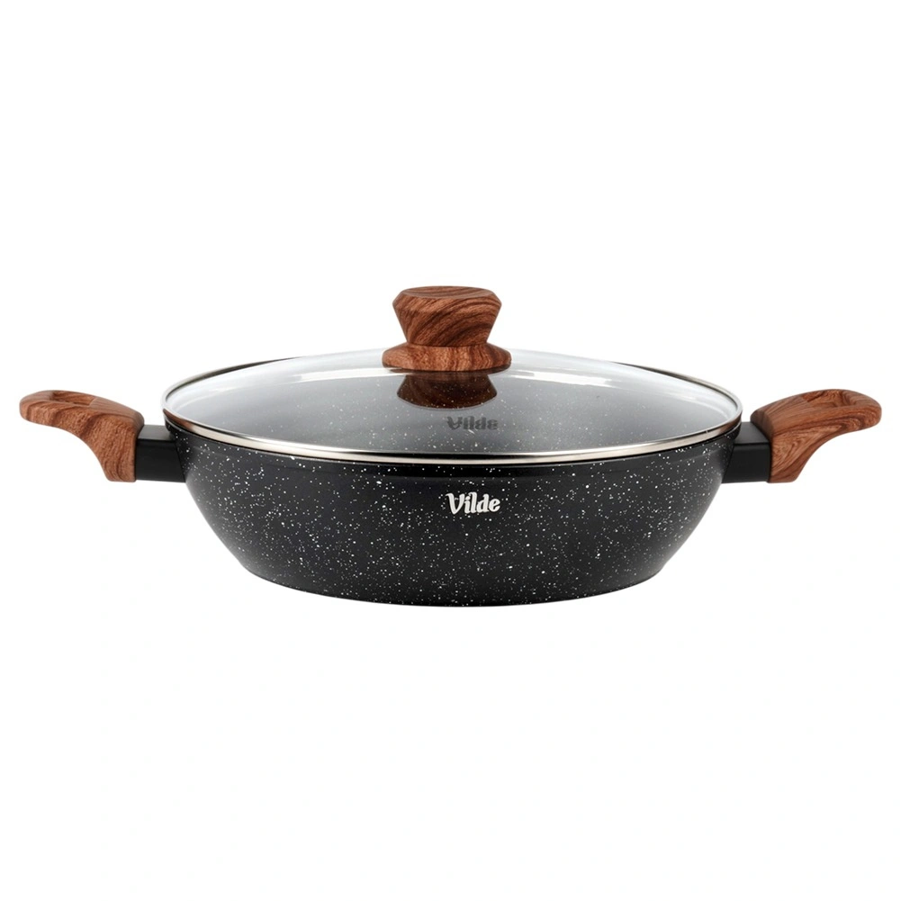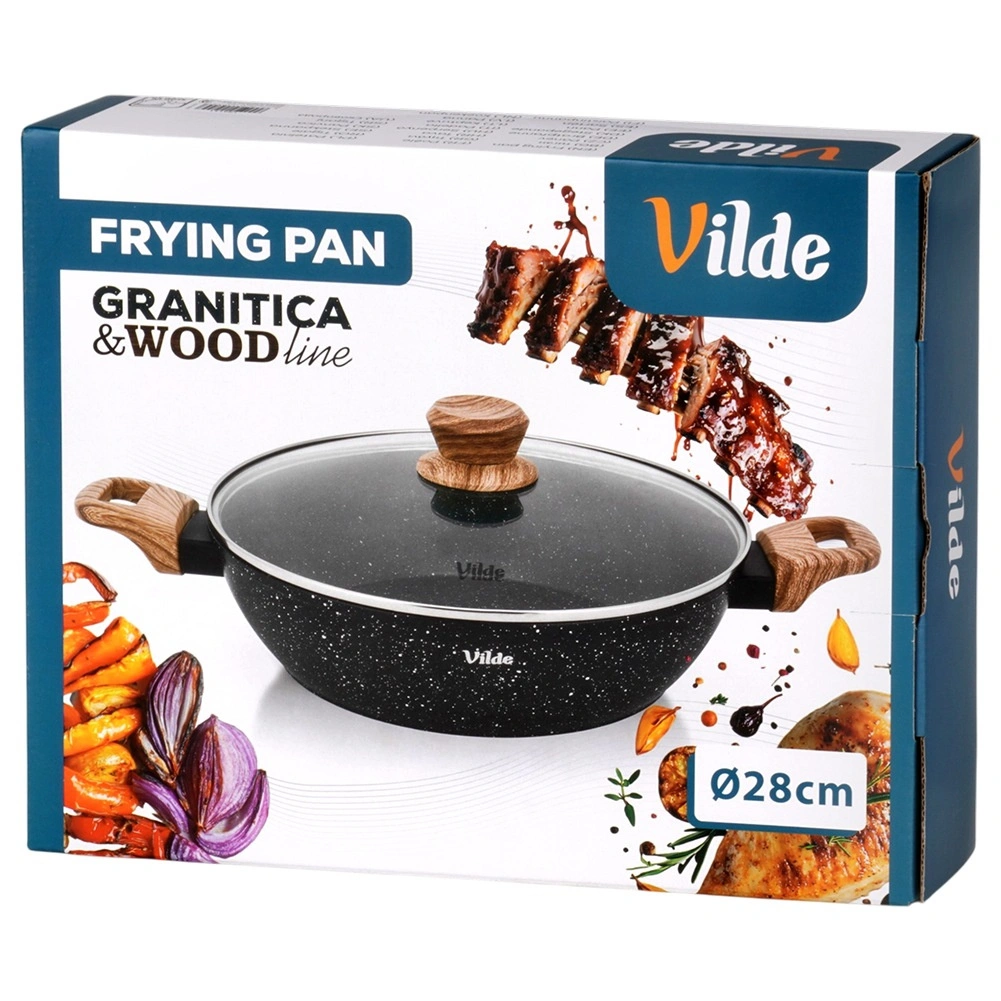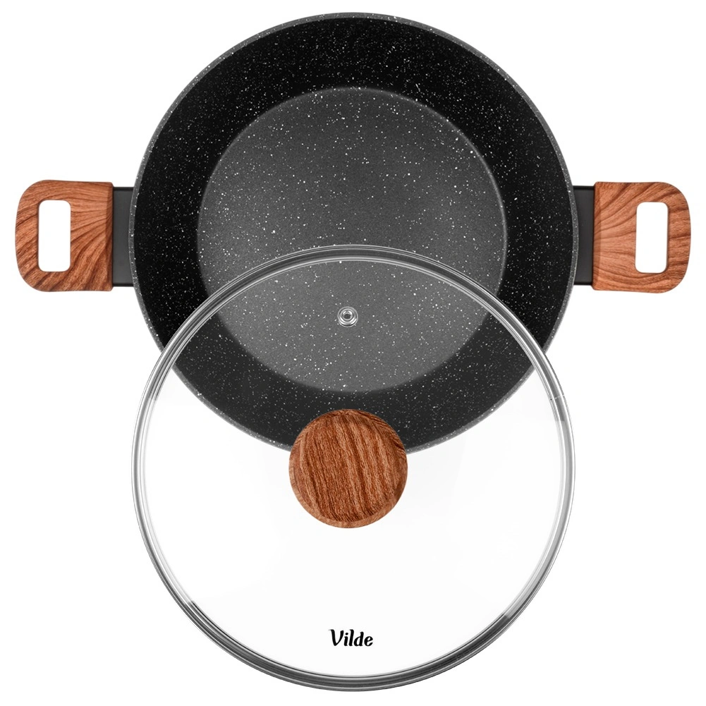The Vilde deep pan from the Granitica Wood line is a versatile helper for frying, braising, and baking. The durable cast aluminum body with a non-stick granite layer ensures even heat distribution and easy release without sticking. The transparent glass lid with a steam vent lets you control cooking without lifting the lid.